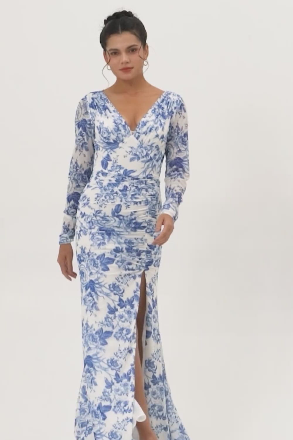 Exude timeless sophistication in this blue and white floral maxi dress, featuring a delicate porcelain-inspired print that radiates elegance. The plunging V-neckline flatters the décolletage, while the fitted bodice and ruched waistline sculpt a graceful silhouette. Long sheer sleeves add a touch of refinement, perfectly balancing the daring thigh-high side slit that brings a modern, sultry edge. Crafted from lightweight chiffon with a smooth lining, this dress offers comfort without sacrificing style, making it the ideal choice for weddings, evening galas, and upscale gatherings.
