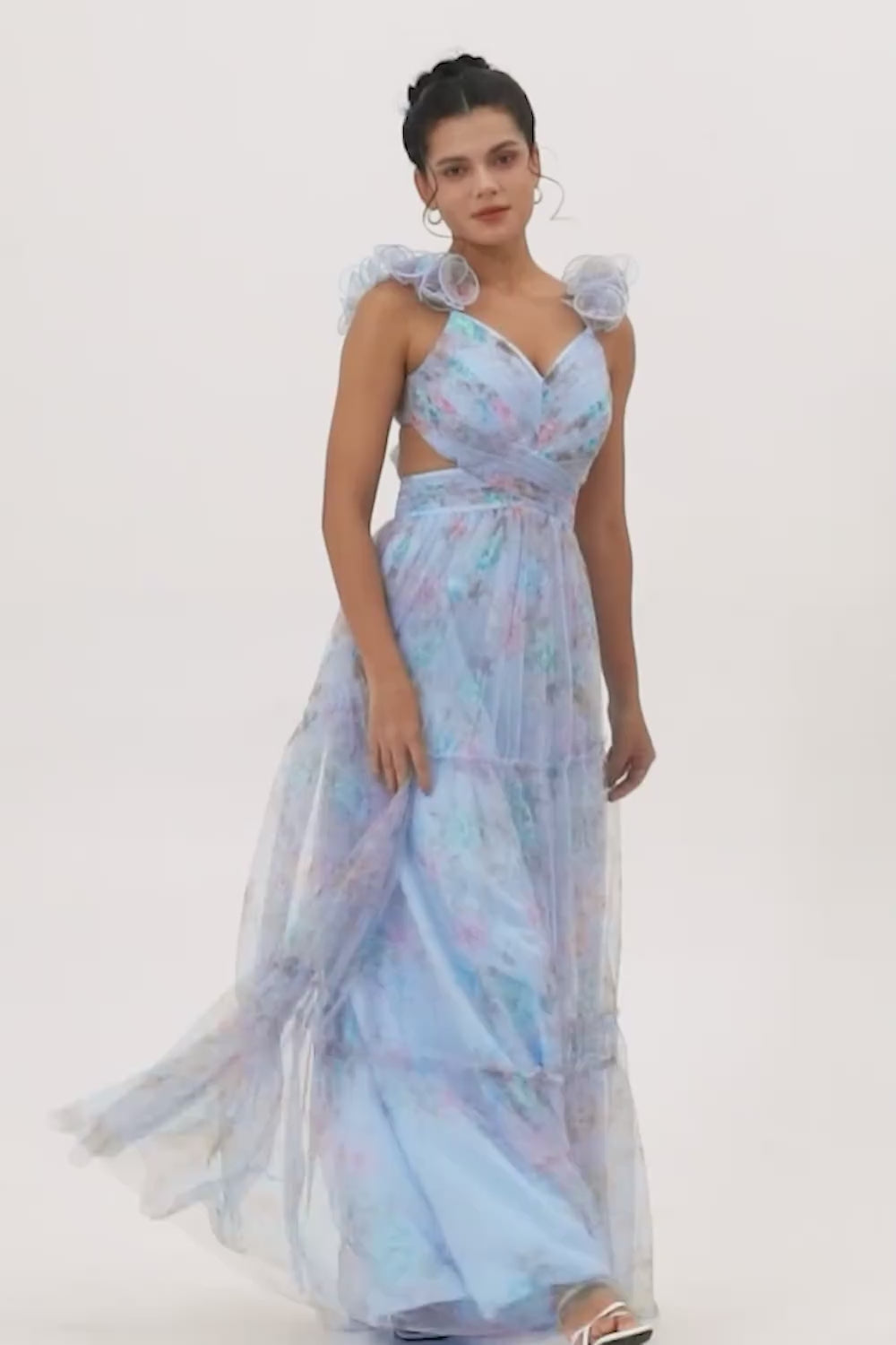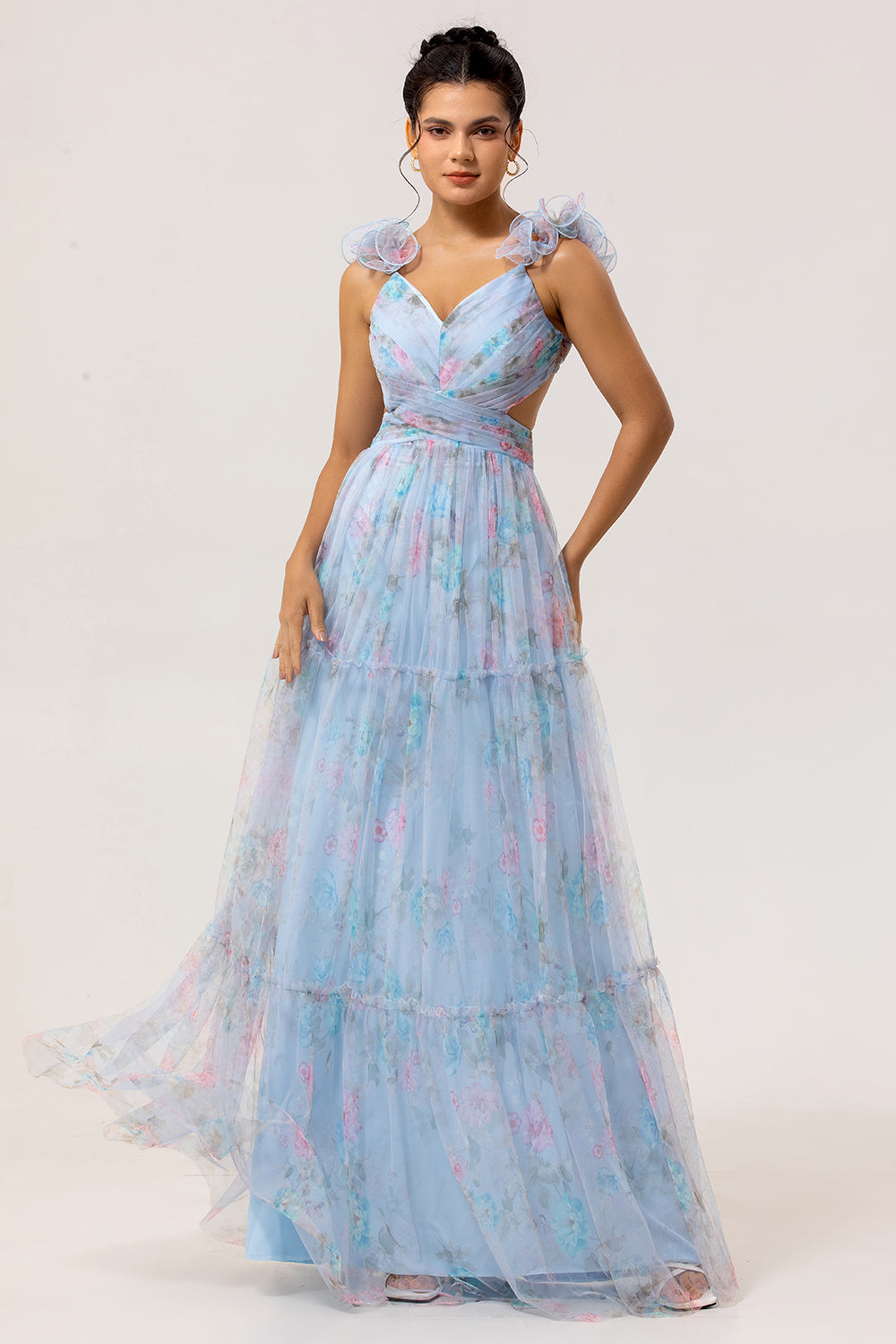 Step into fairytale elegance with this pastel blue tulle maxi dress, adorned with a delicate watercolor floral print for a dreamy, ethereal charm. The pleated V-neck bodice features a flattering crisscross design that cinches at the waist, while soft cutout sides add a modern touch. Romantic 3D floral appliqués embellish the shoulders, creating a statement detail that captures attention. The tiered tulle skirt flows gracefully to the floor, offering light, airy movement with every step. Perfect for garden weddings, spring soirées, or any occasion where you want to exude whimsical sophistication.