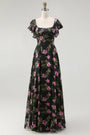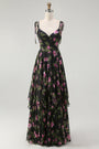 Black Pink Floral A Line Strapless Midi Bridesmaid Dress