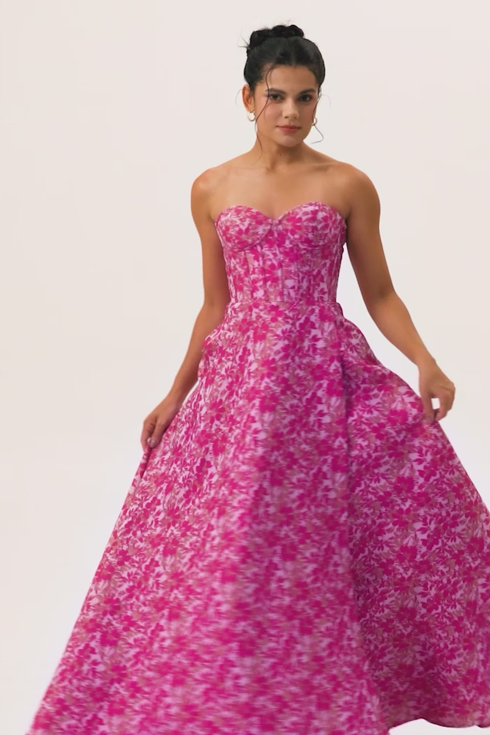 Fuchsia Floral A-Line Strapless Corset Floor Length Corset Satin Jacquard Dress with Slit