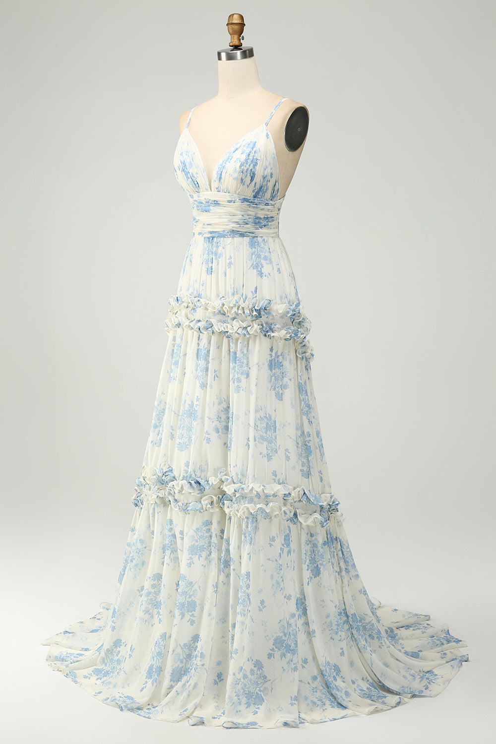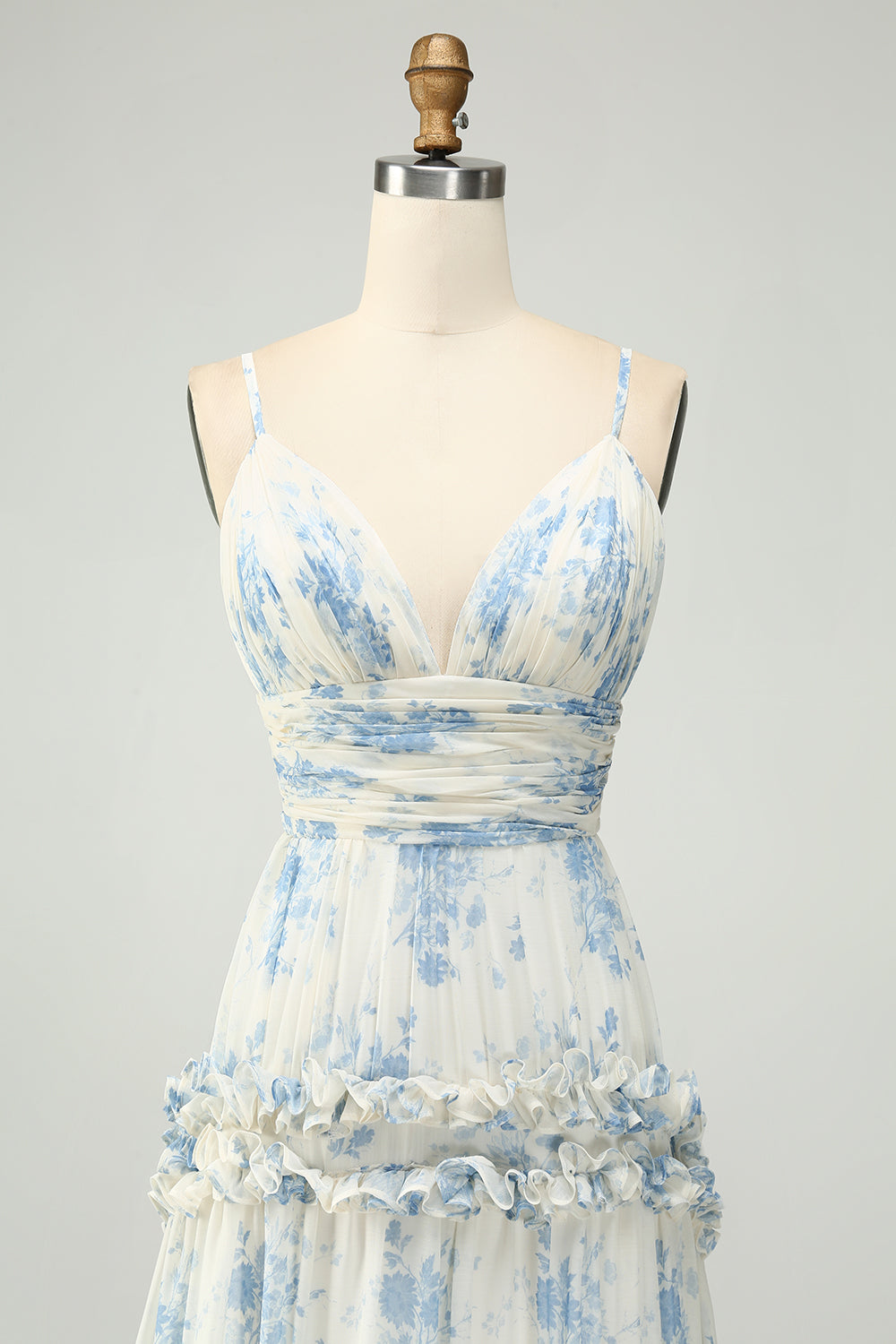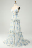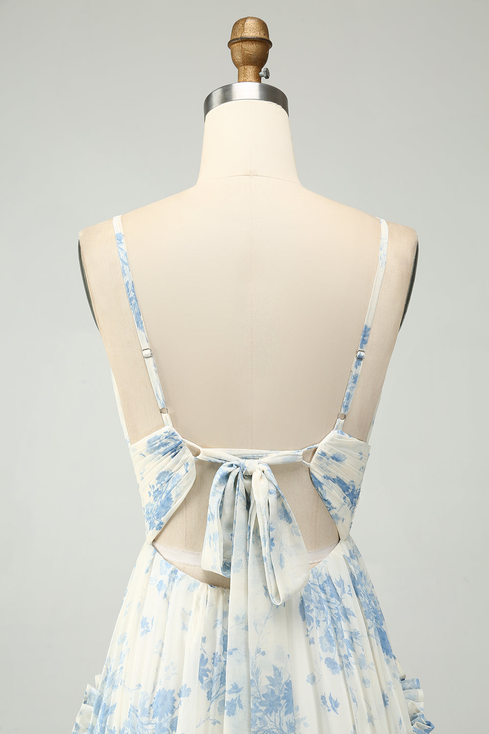 A-Line Spaghetti Straps Pleated White Blue Flower Maxi Bridesmaid Dress