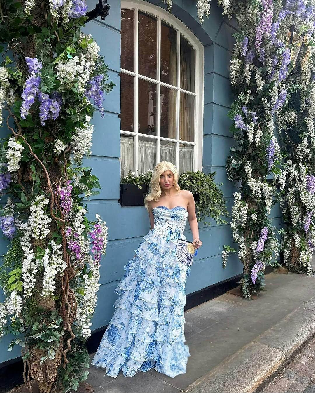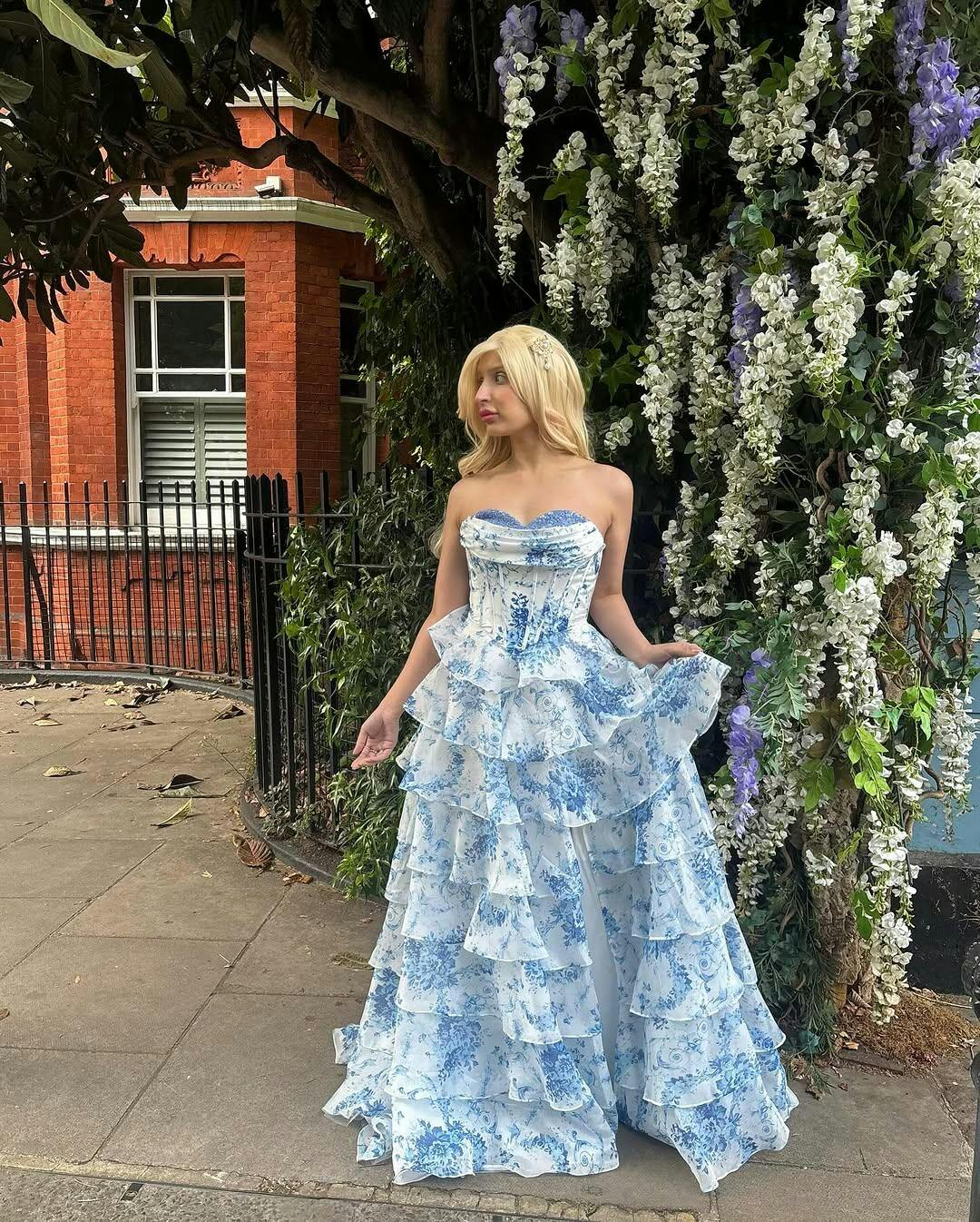Blush Floral A-Line Strapless Ruffled Corset Printed Tiered Long Prom Dress with Slit