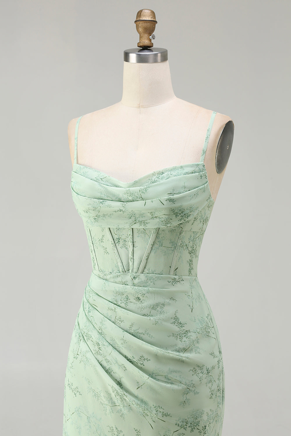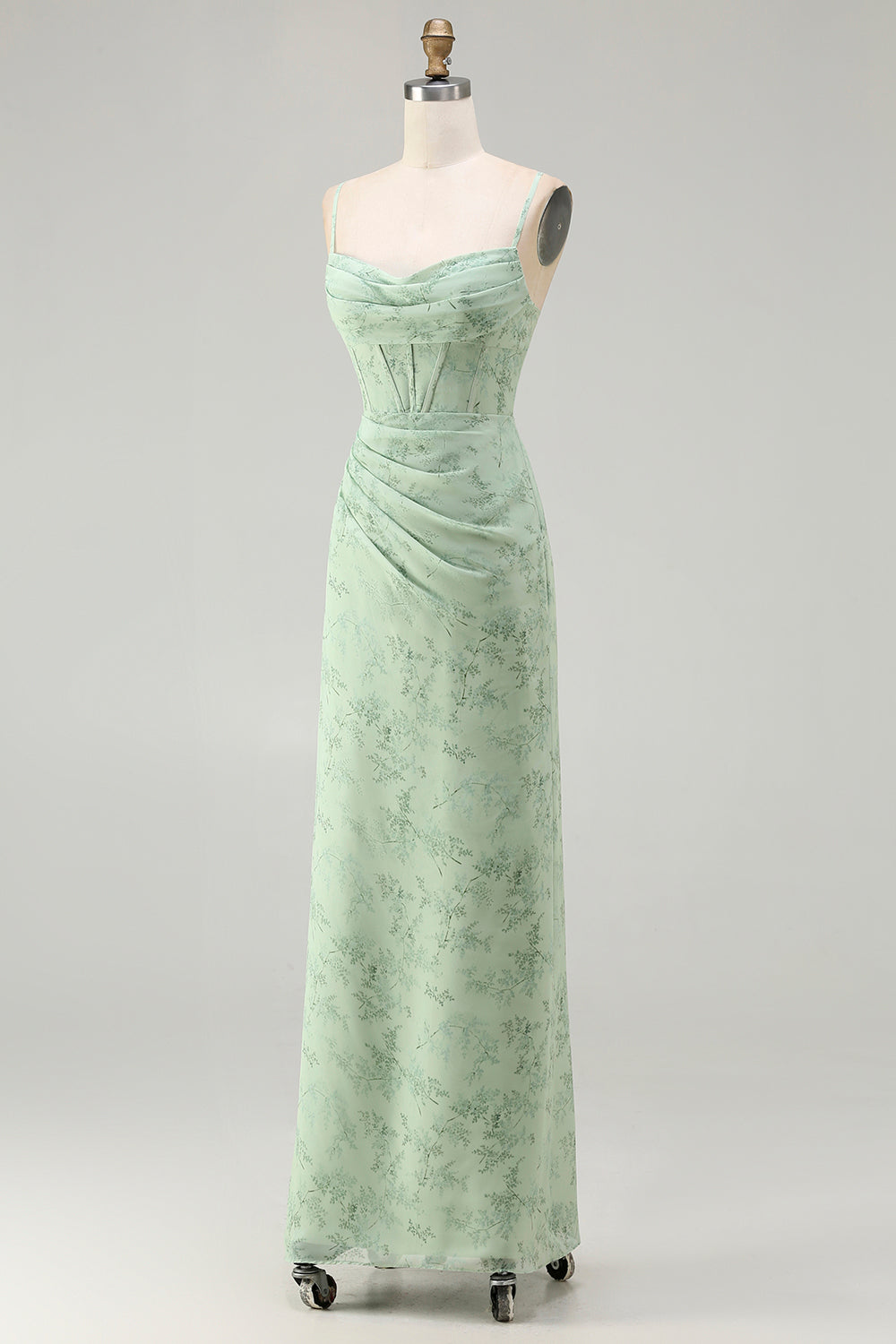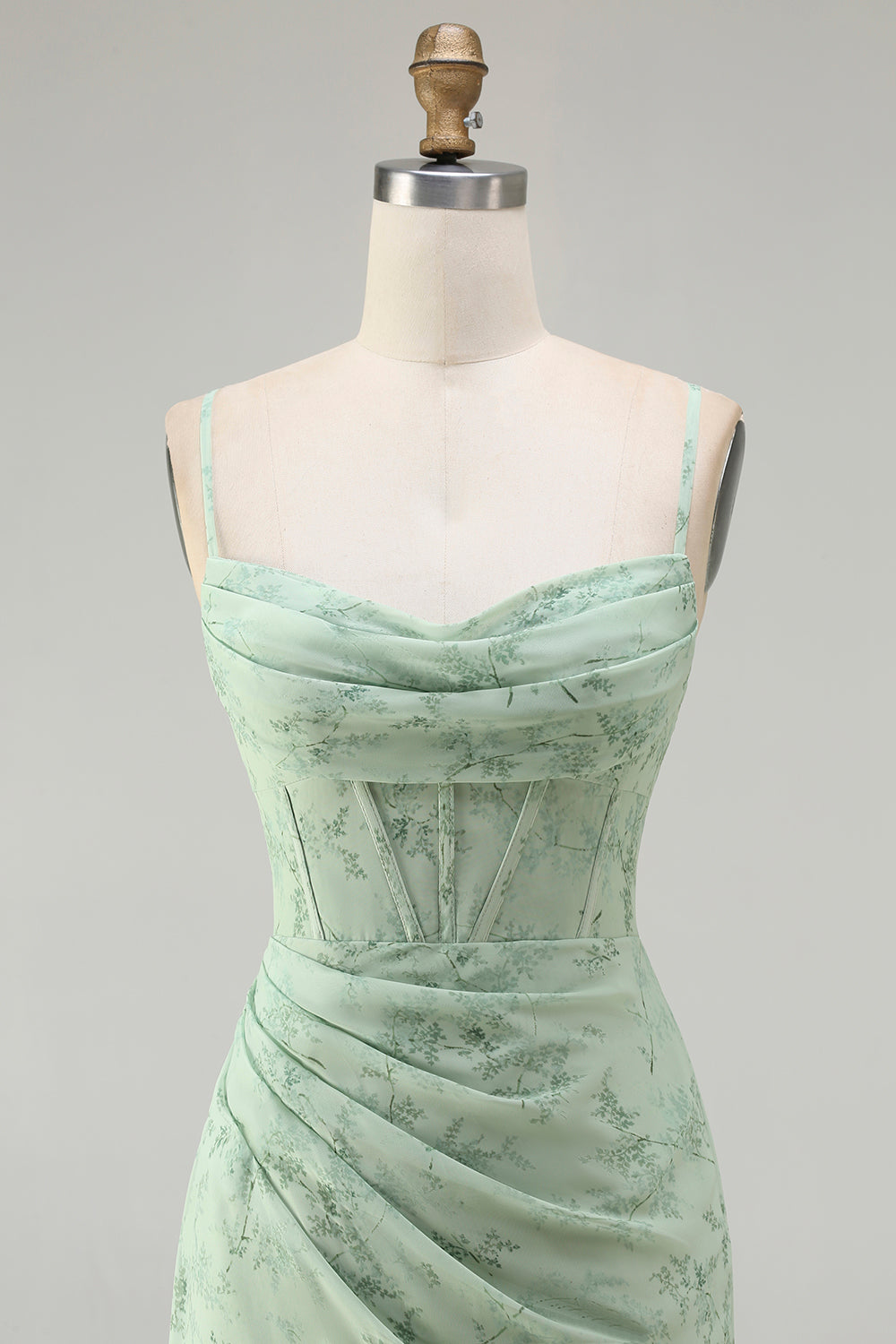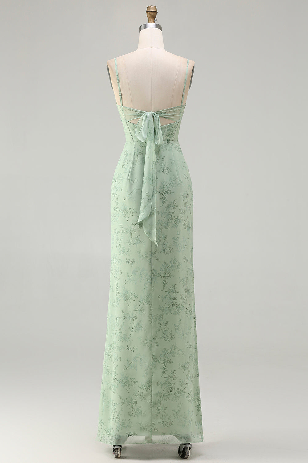 Green Sheath Corset Print Floral Long Bridesmaid Dress with Lace Up Back