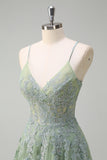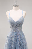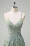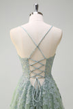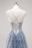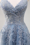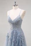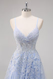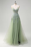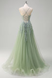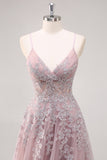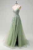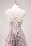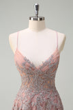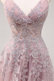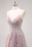 Blush Tulle A-Line Spaghetti Straps Beaded Long Prom Dress with Slit