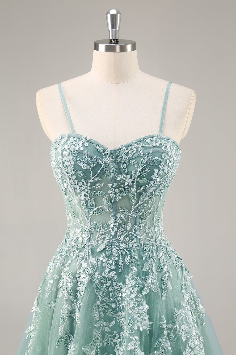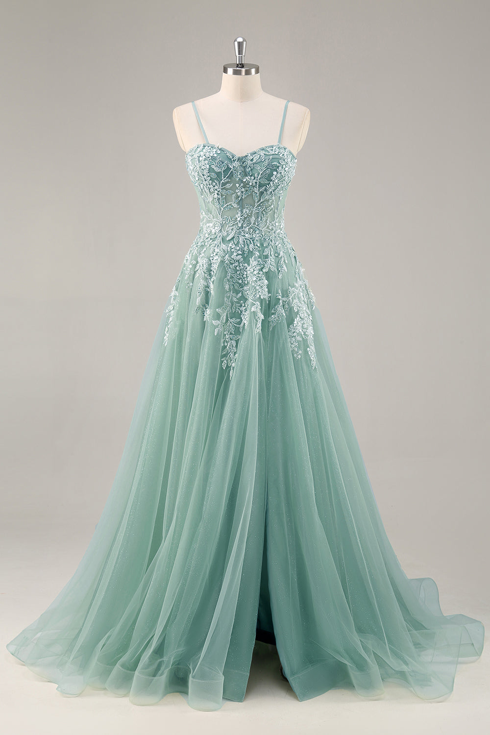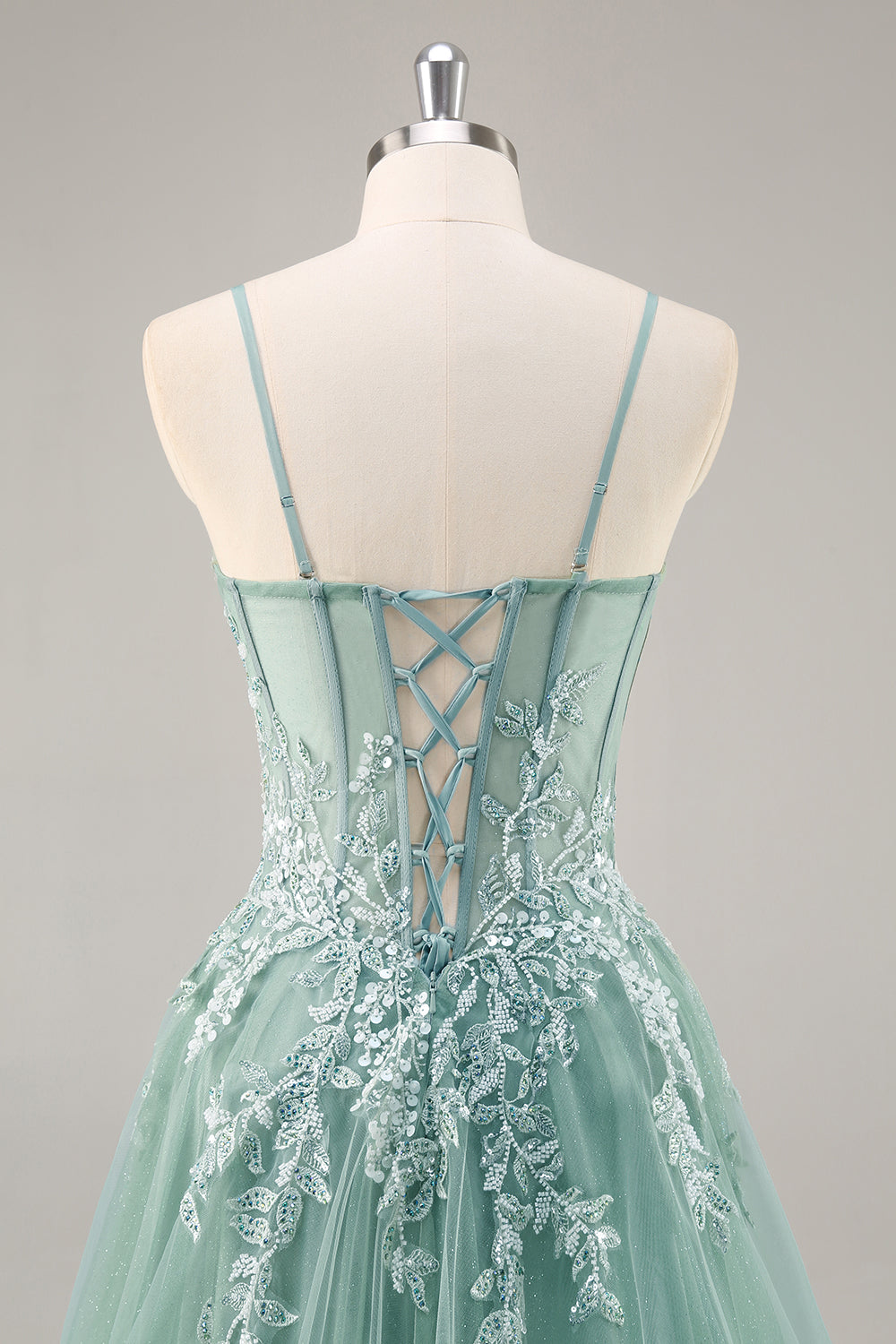 Sage Green Tulle A-Line Corset Beaded Long Prom Dress with Slit