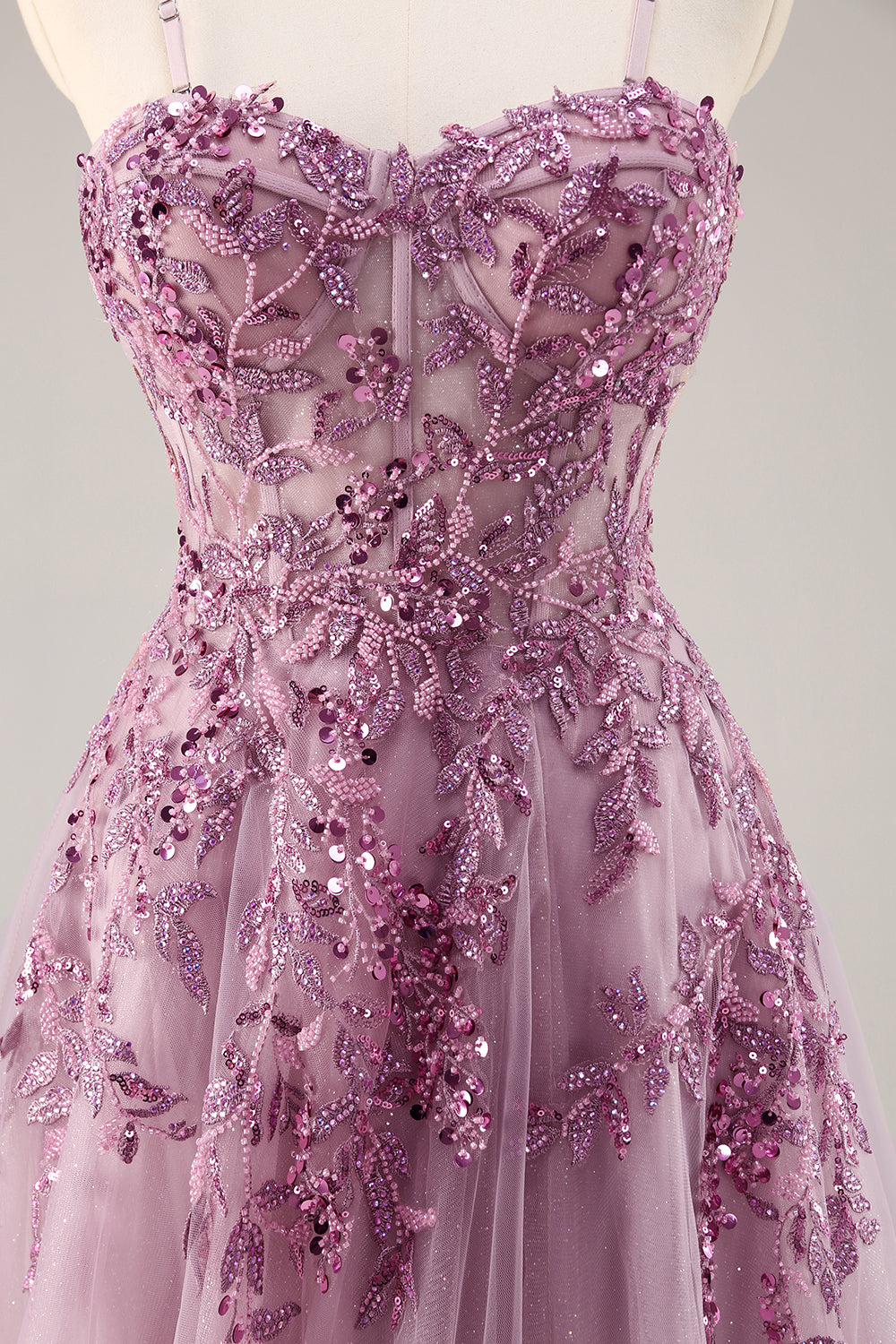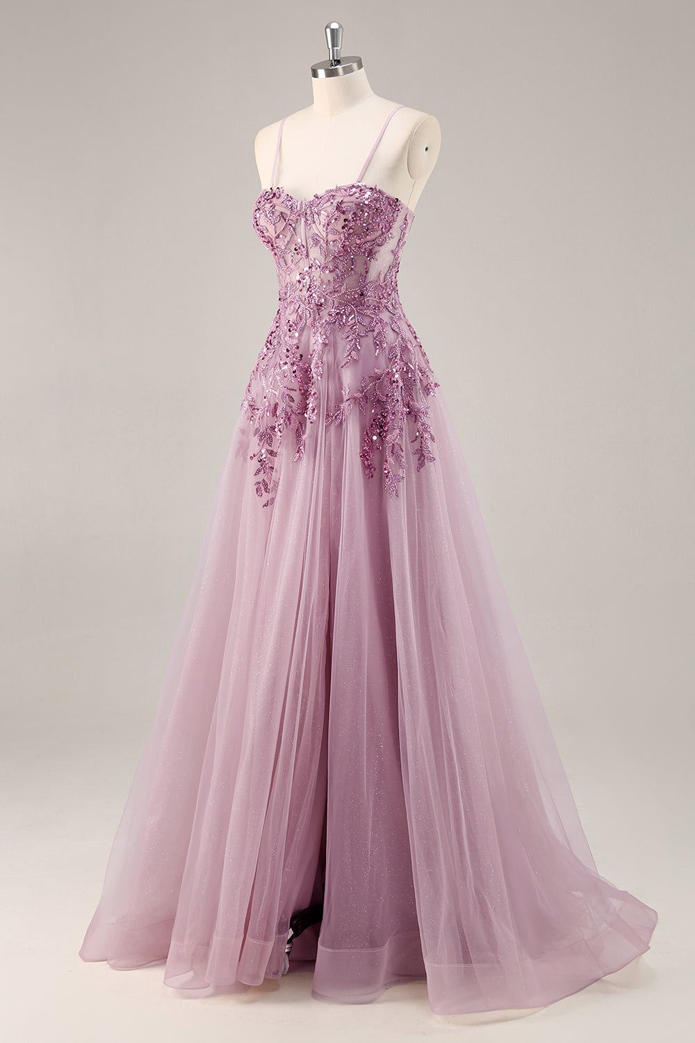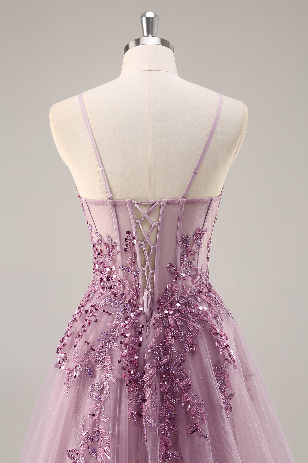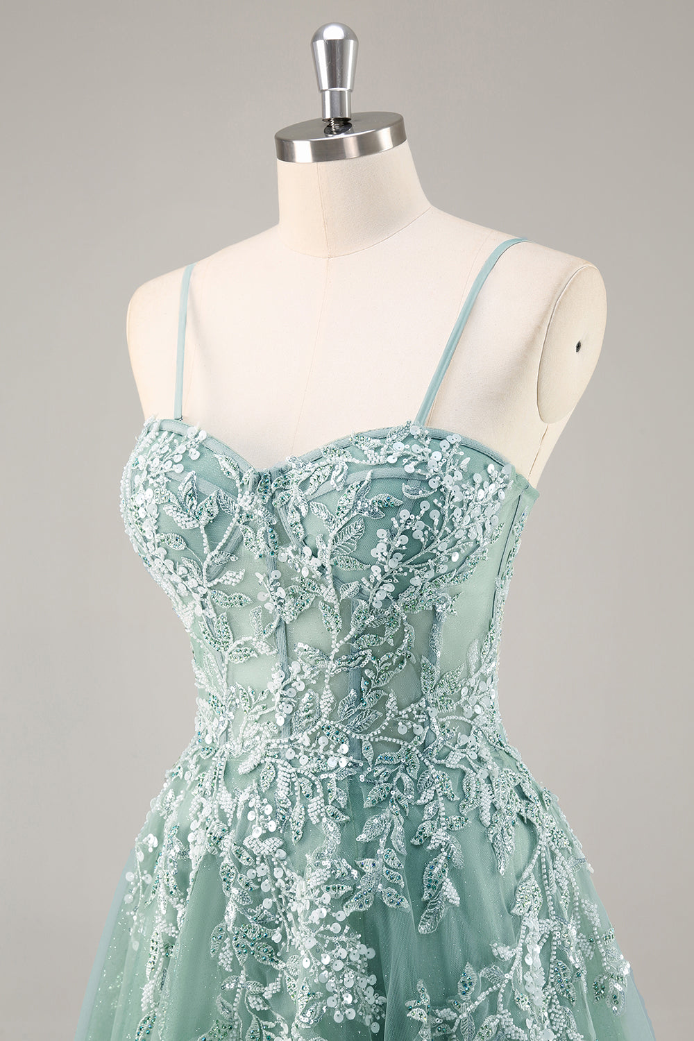 Sage Green Tulle A-Line Corset Beaded Long Prom Dress with Slit