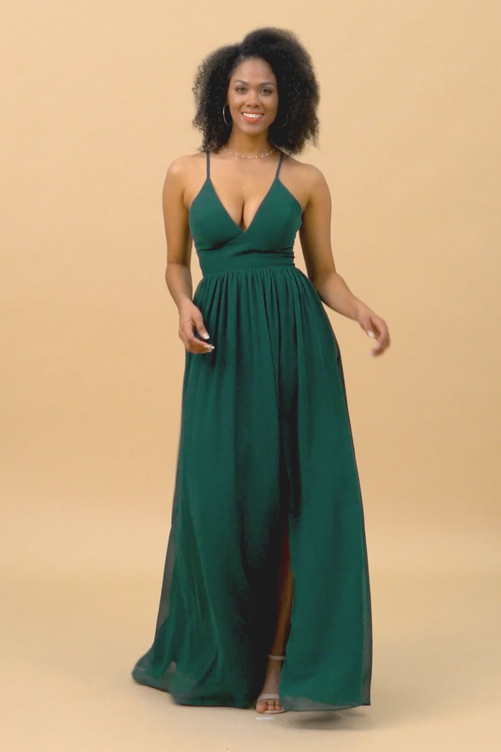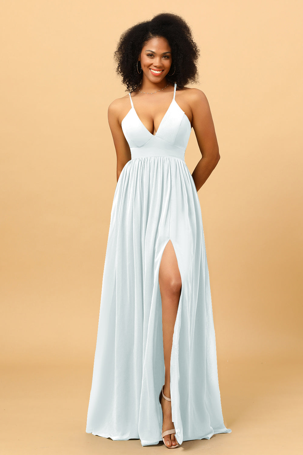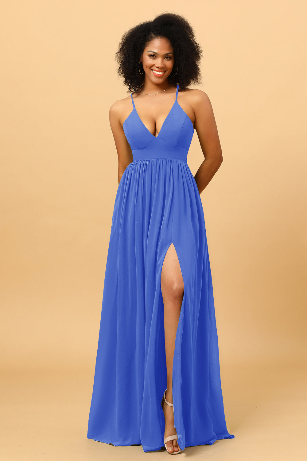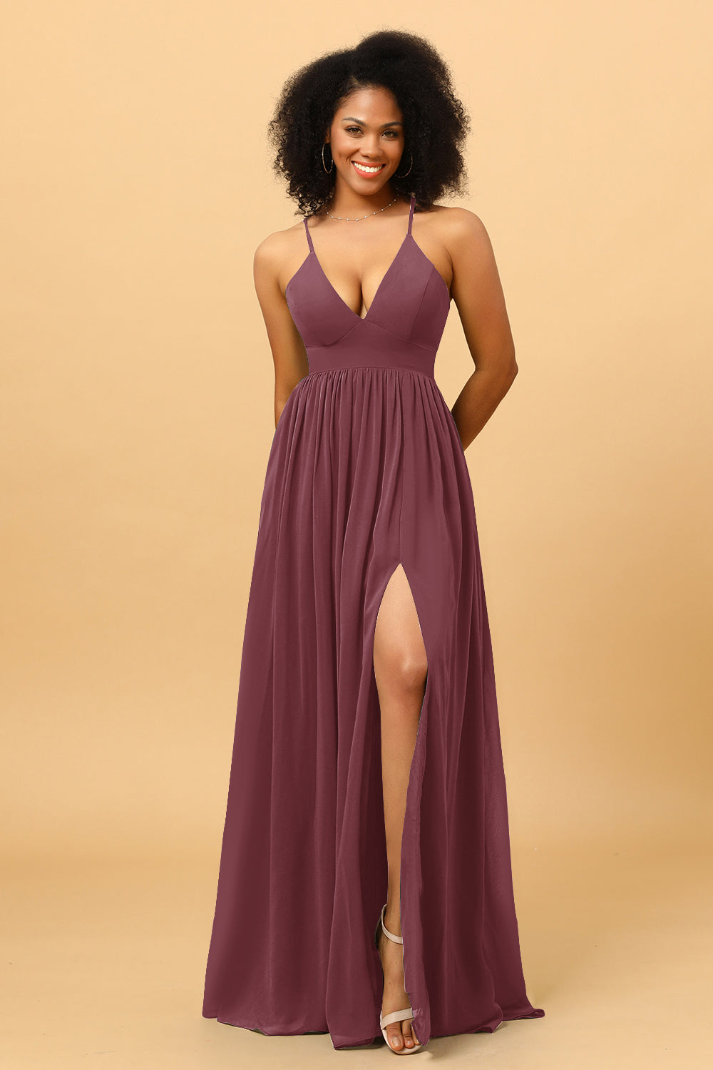 Made of chiffon fabric, this chiffon v-neck bridesmaid dress is timeless. Booty ruching creates a flattering silhouette, while a high slit skirt lets you move with ease.