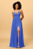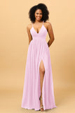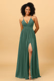 A Line V Neck Spaghetti Straps Chiffon Bridesmaid Dress with Slit