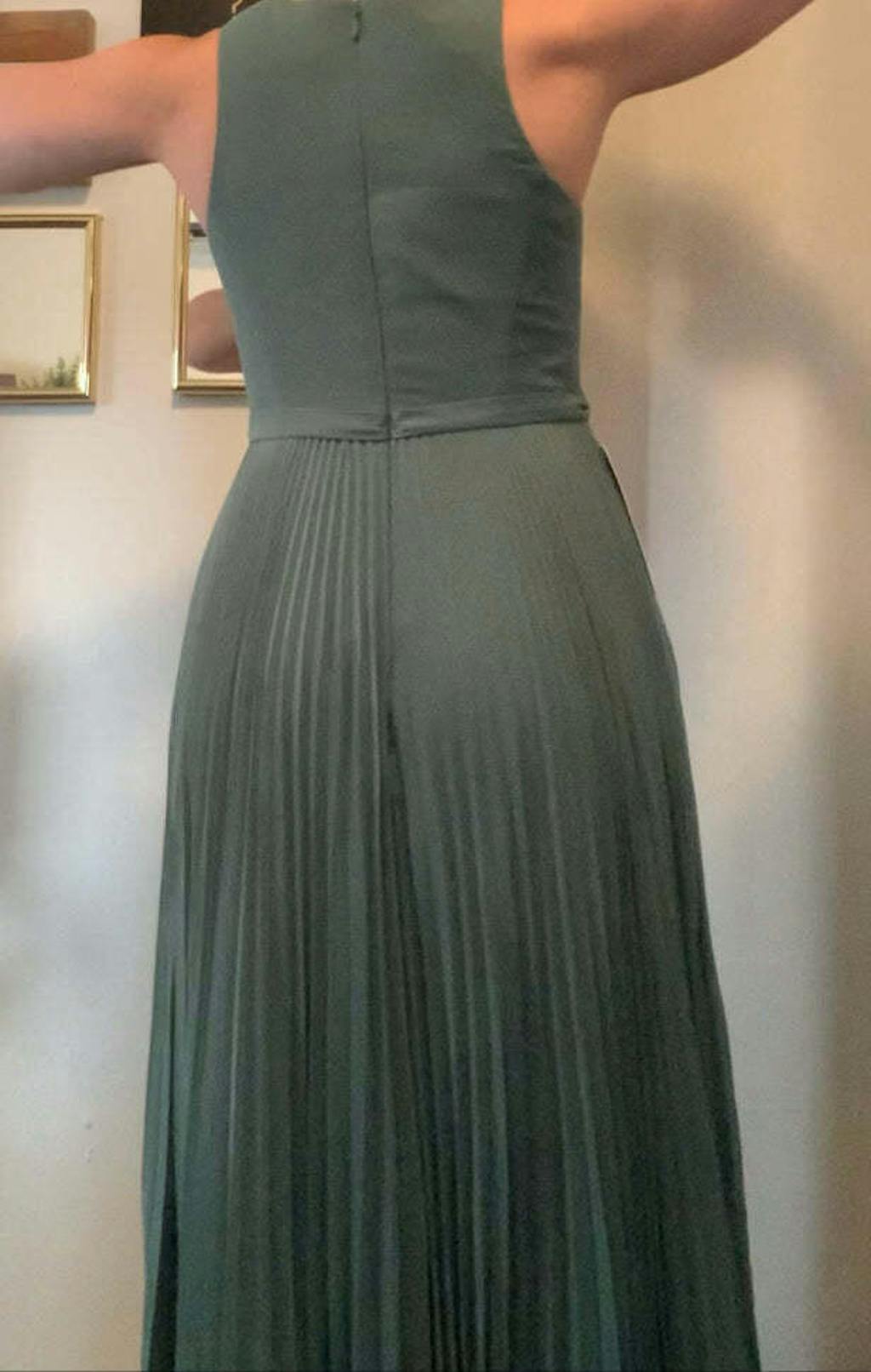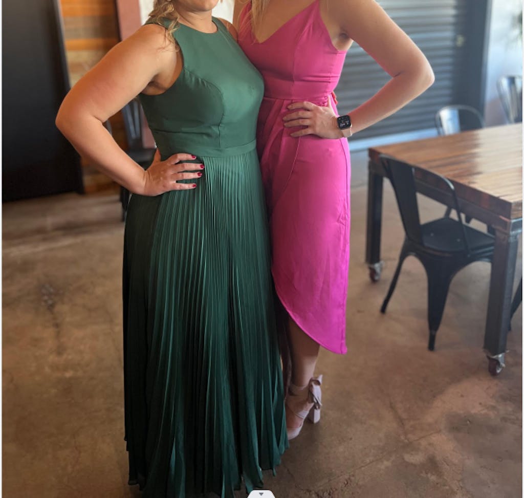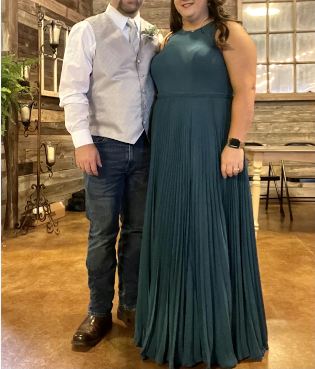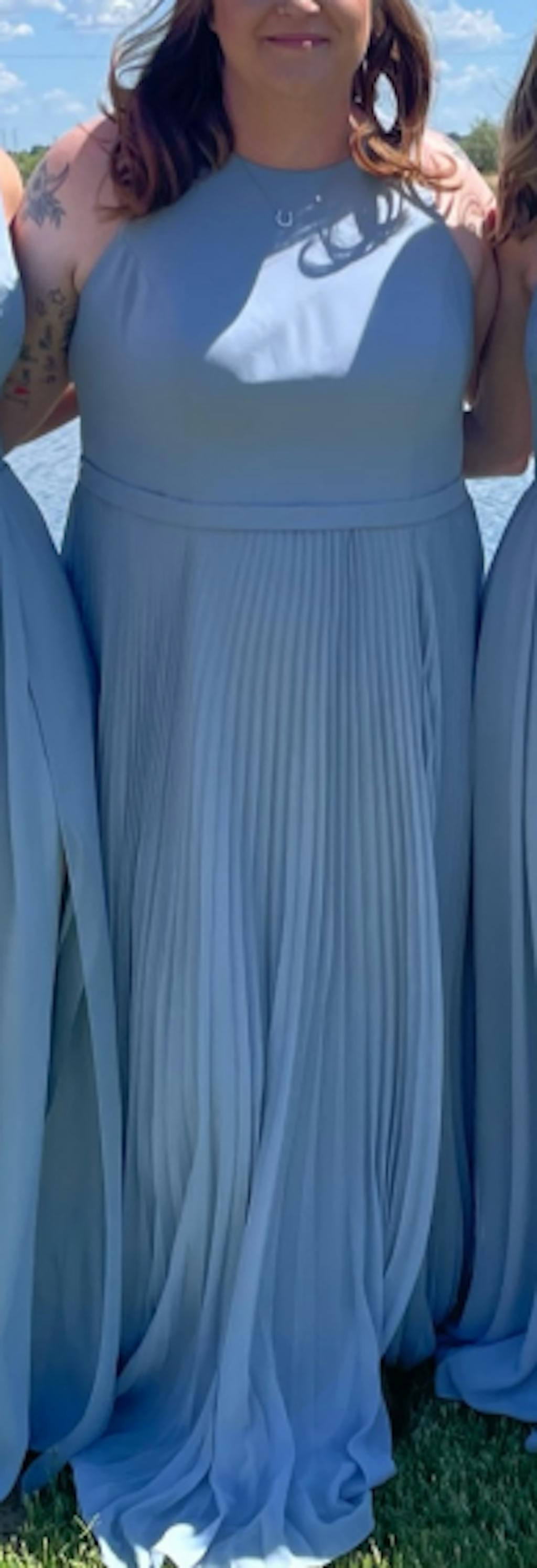 The dress was a hit on the wedding day. All bridesmaids were different sizes and shapes, and the dress looked great on everyone. It was comfortable and withstood the September heat & humidity.