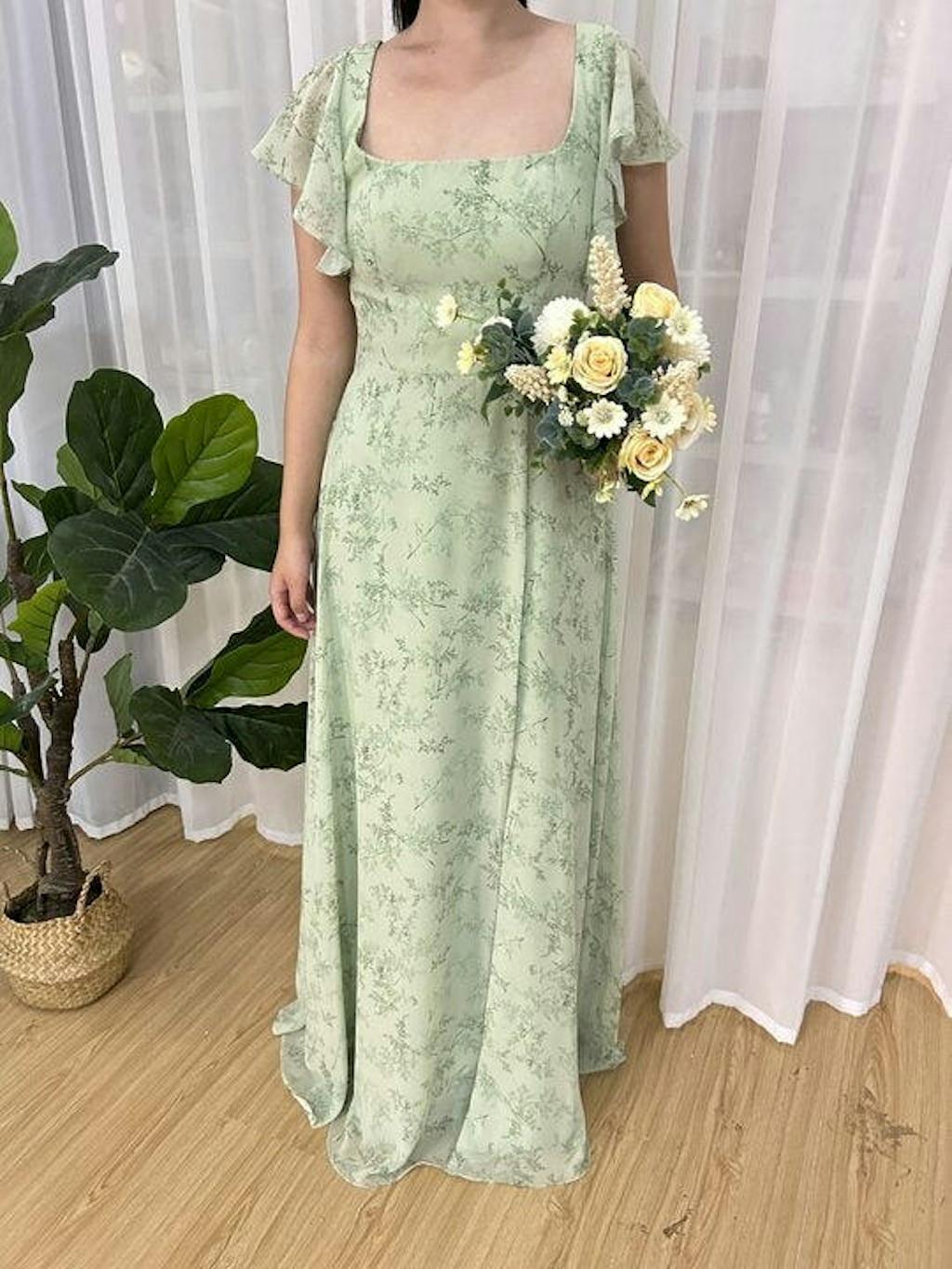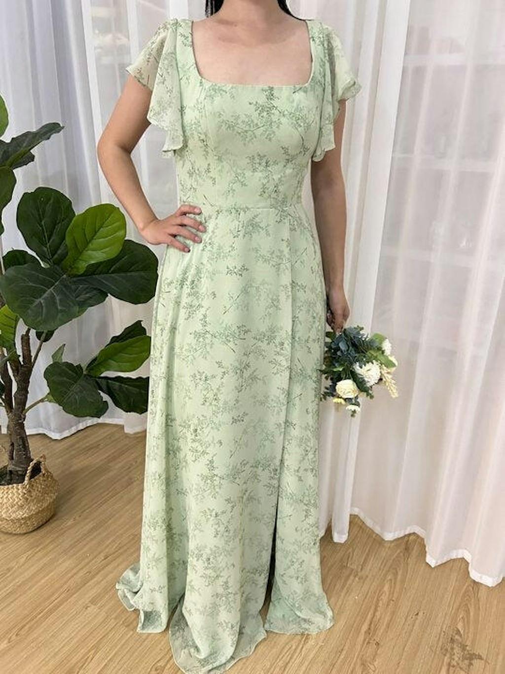 Dusty Sage A-Line Square Neck Floor Length Print Bridesmaid Dress with Slit