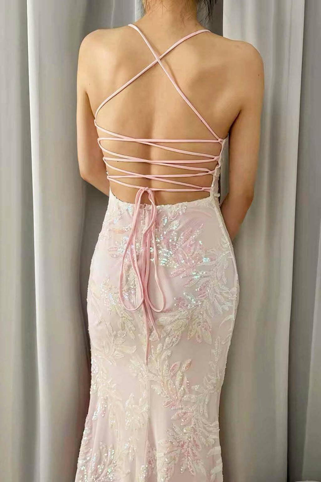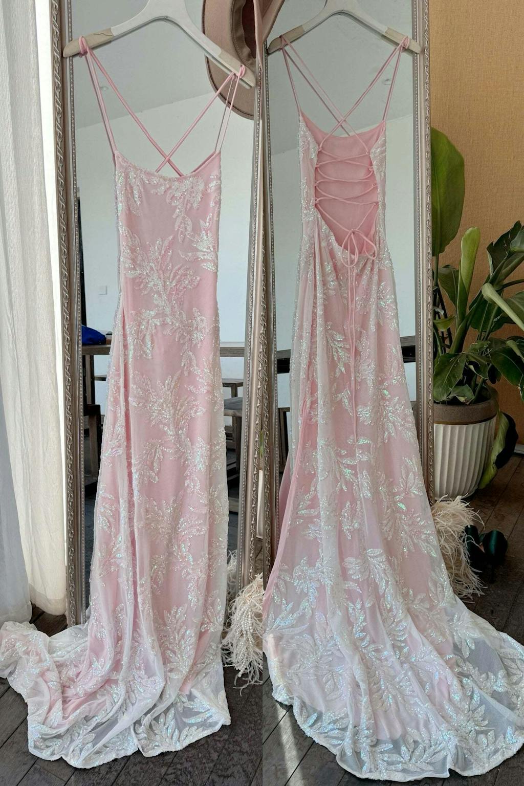 Pink Mermaid Spaghetti Straps Sparkly Long Prom Dress with Slit
