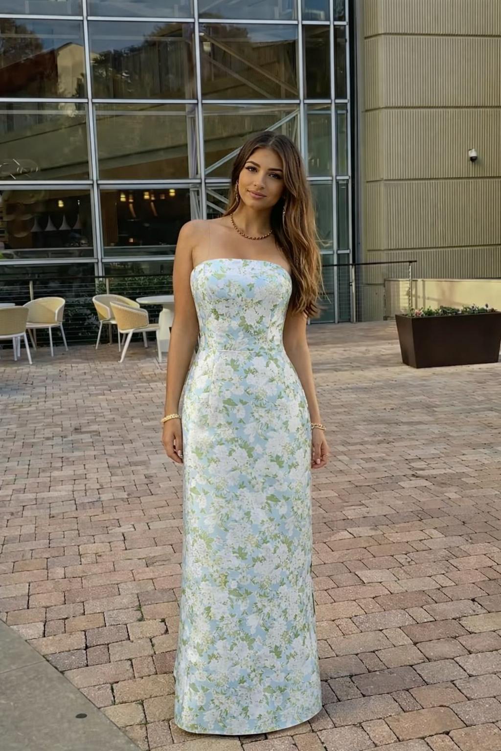Sheath Strapless White Floral Back Slit Satin Blue Maxi Dress with Pockets