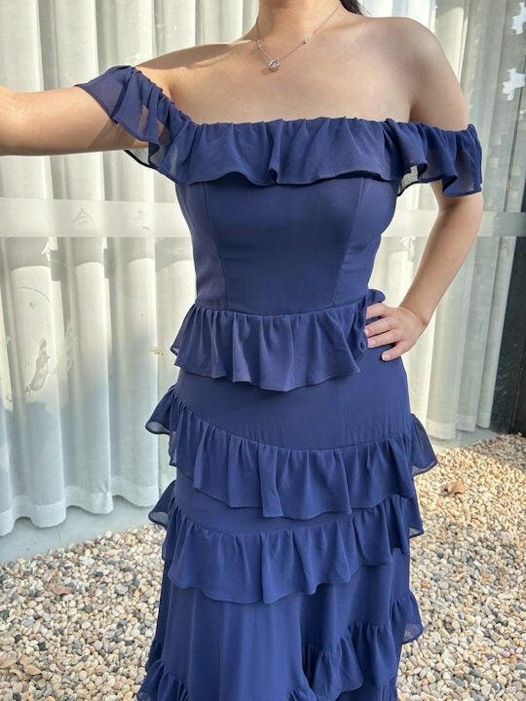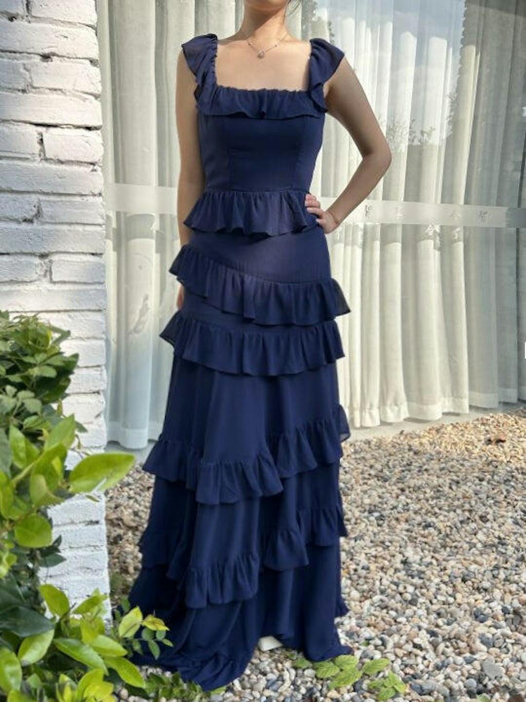 Dark Navy A Line Square Neck Tiered Long Chiffon Bridesmaid Dress with Ruffles
