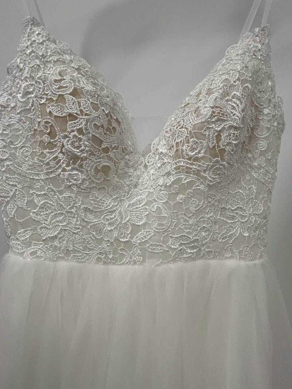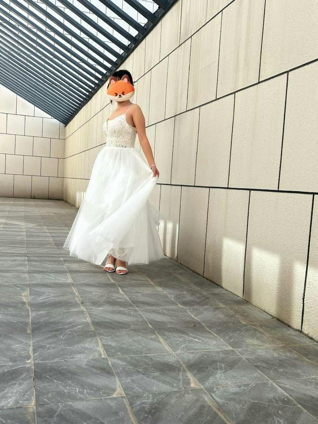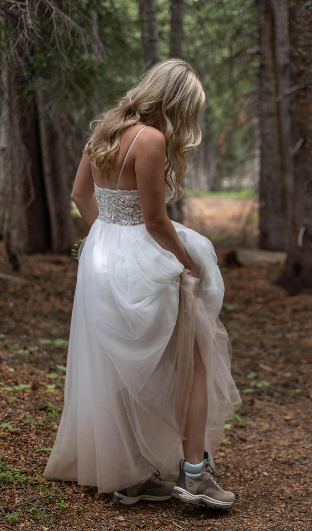 Wore this dress for my Colorado Mountain elopement and it’s a perfect length for someone that is 5’2. I needed no alterations and had a lot of fun wearing the dress on my wedding day.