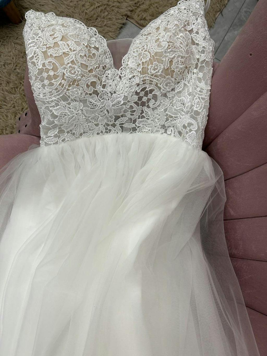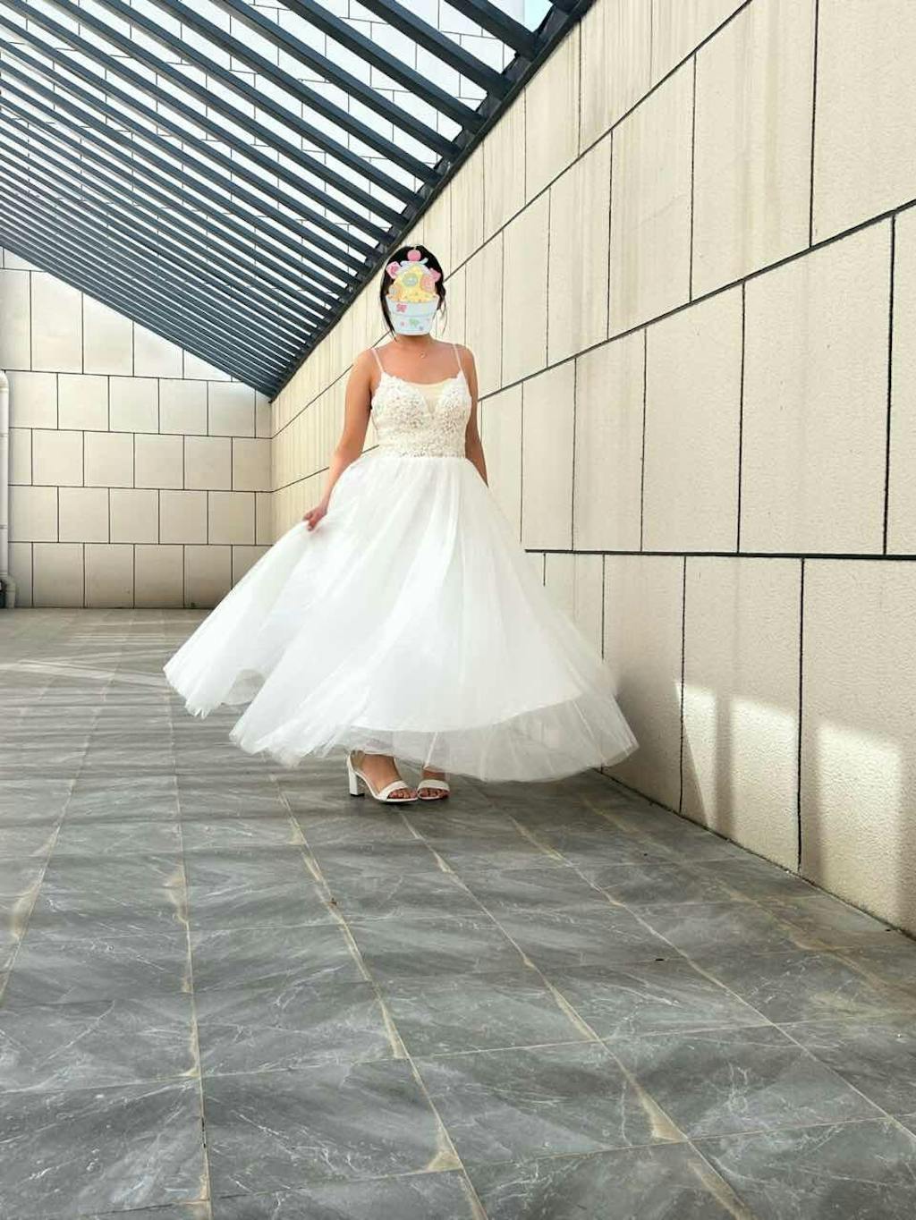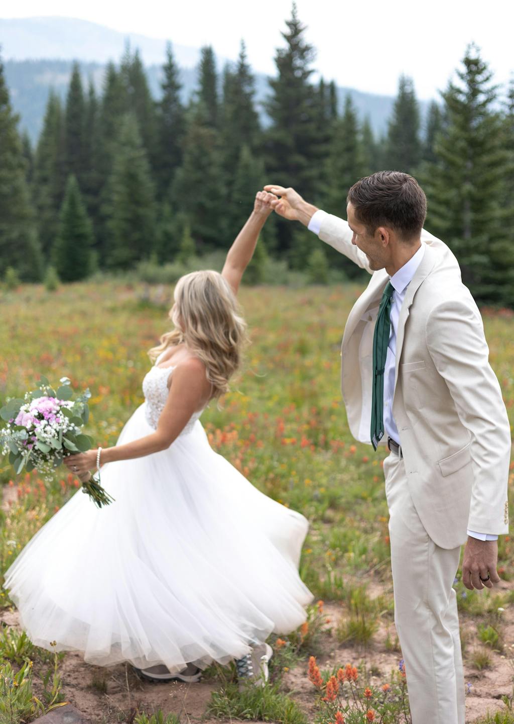Wore this dress for my Colorado Mountain elopement and it’s a perfect length for someone that is 5’2. I needed no alterations and had a lot of fun wearing the dress on my wedding day.
