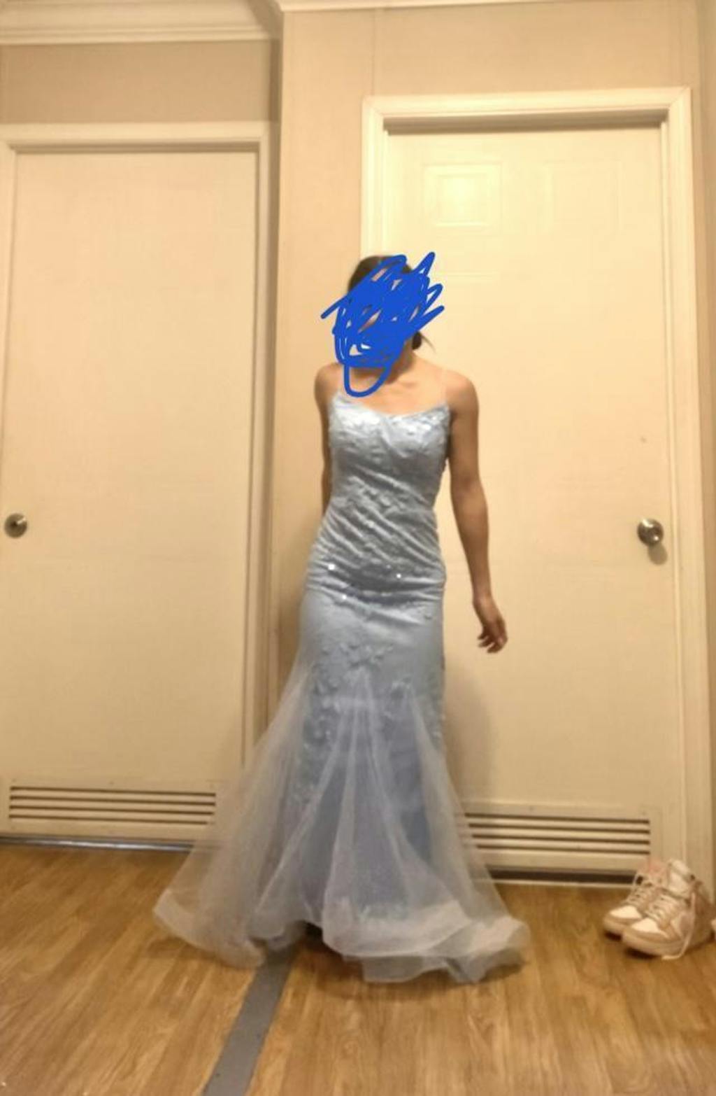 The mermaid silhouette is incredibly flattering, and the appliques add a luxurious touch. The light blue color is so dreamy, and the sparkly beading catches the light beautifully.