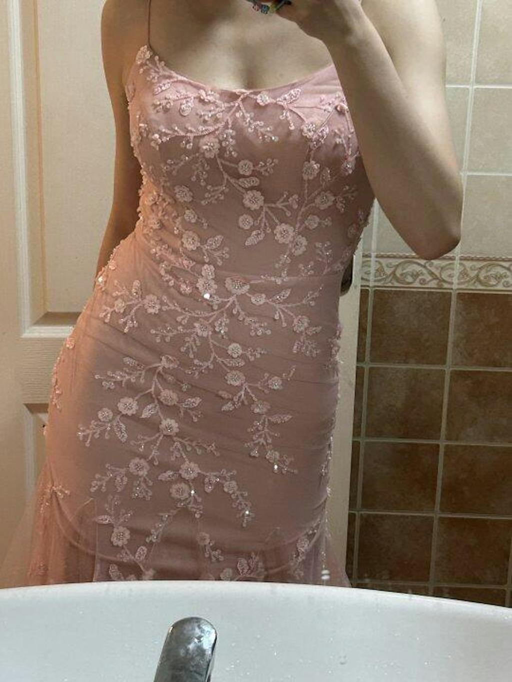 The sparkly beading is breathtaking, and the mermaid shape hugs perfectly. The pink color is unique and gorgeous.