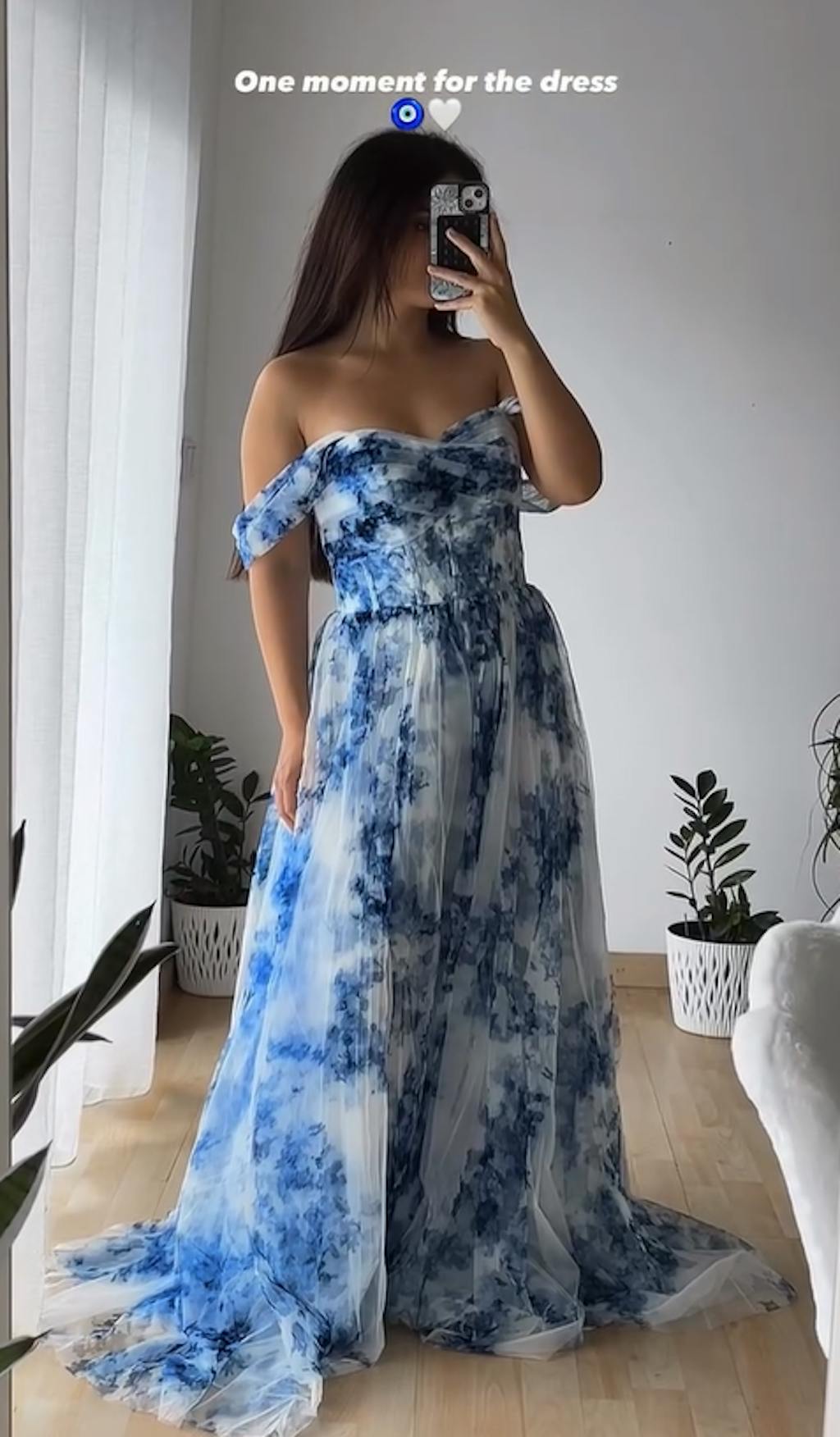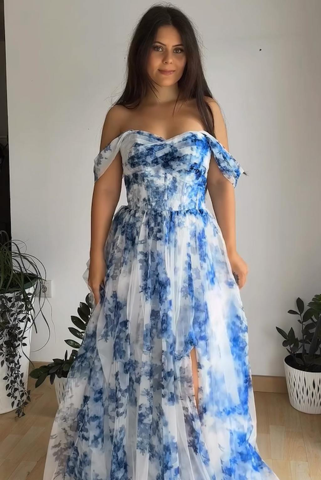 Delicately crafted with a soft blue watercolor floral print, this romantic dress features an off-the-shoulder neckline with ruched tulle draping across the bodice. The structured corset-style top enhances the silhouette, while the airy layered skirt flows gracefully to the floor, creating an ethereal and sophisticated look. Perfect for formal occasions, garden parties, or outdoor weddings.