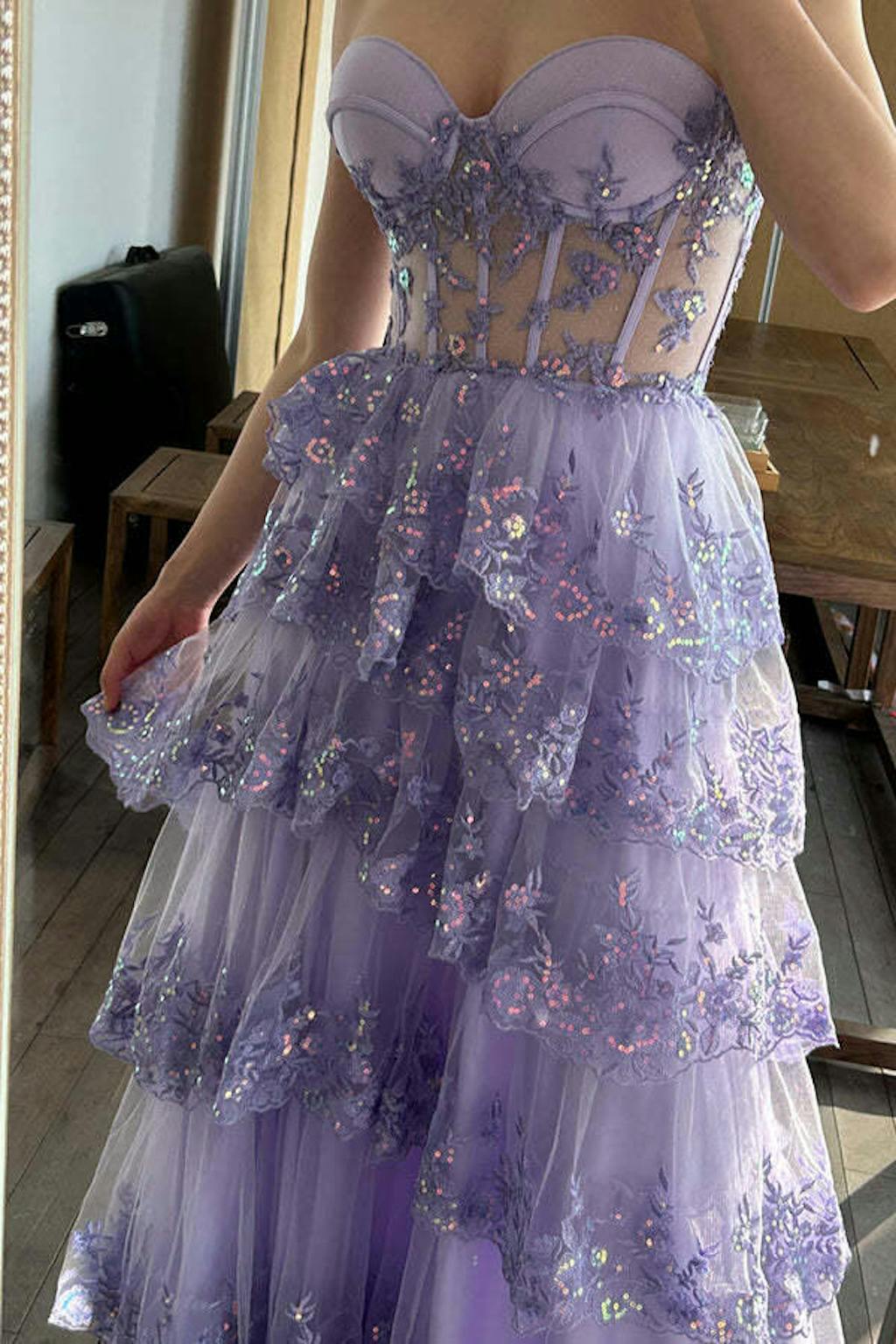 Princess Purple A Line Sweetheart Tiered Sequin Tulle Prom Dress