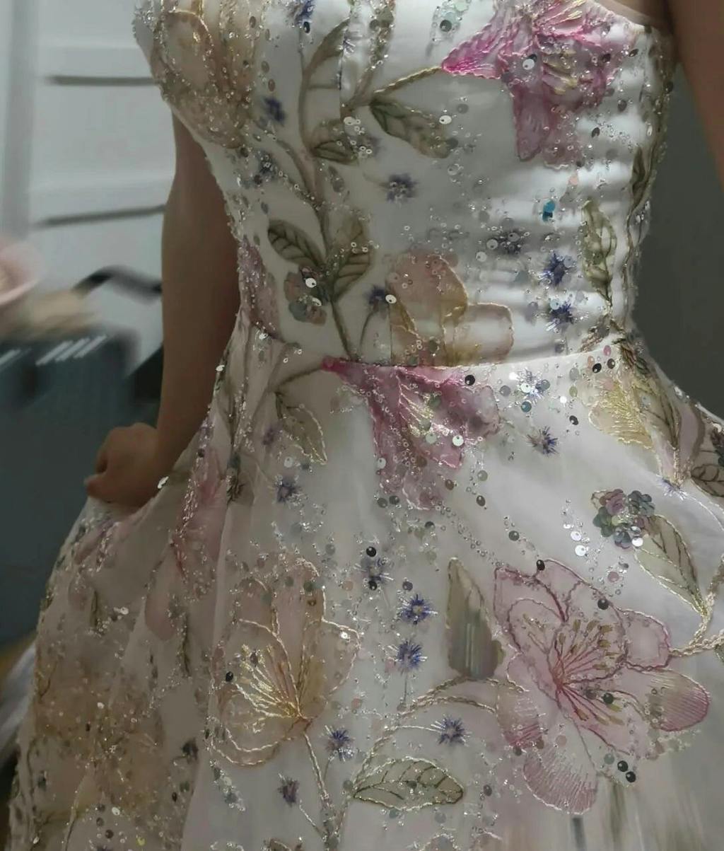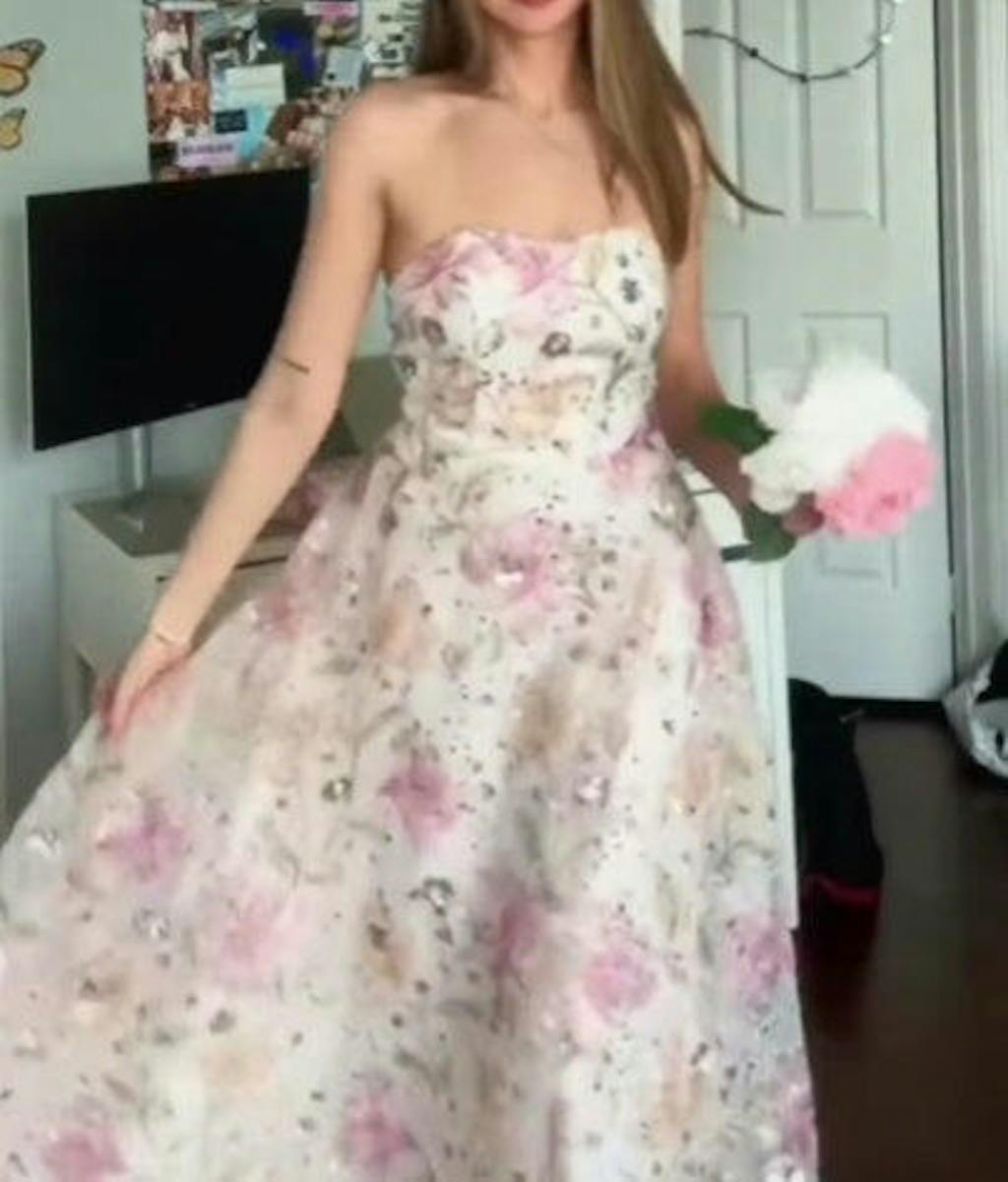 Pink A-Line Strapless Sparkly Sequin Floral Long Prom Dress