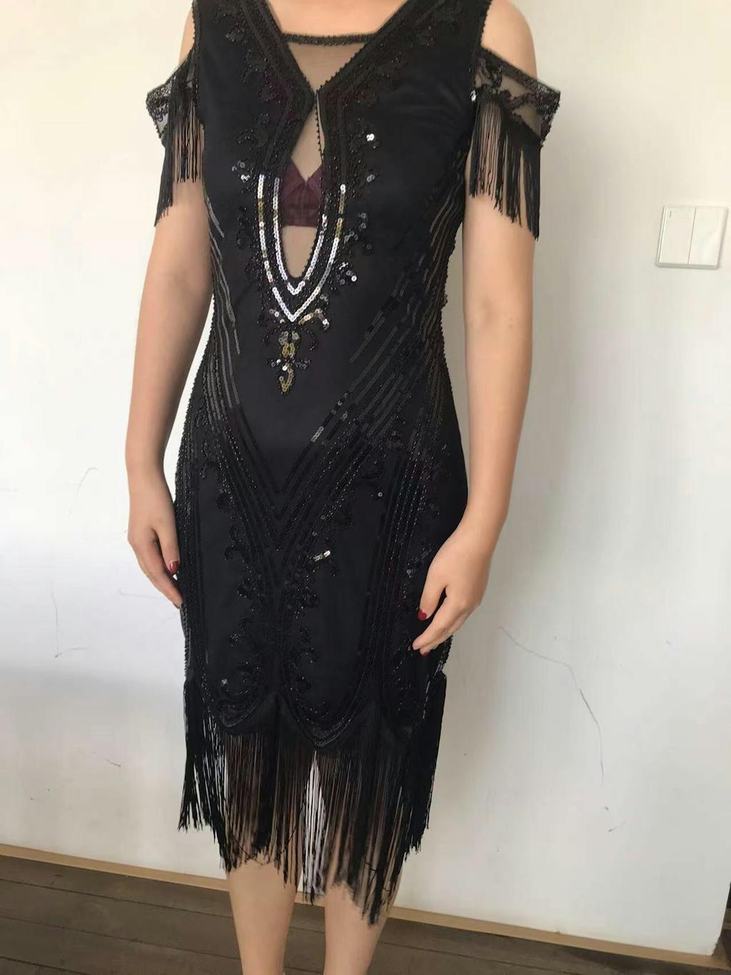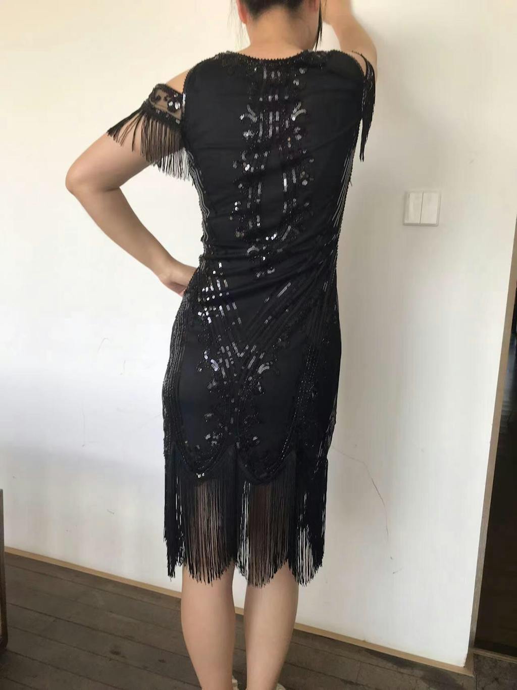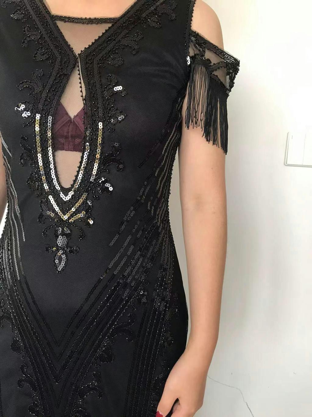 Black Cold Shoulder Sequins Fringes Flapper Gatsby Dress