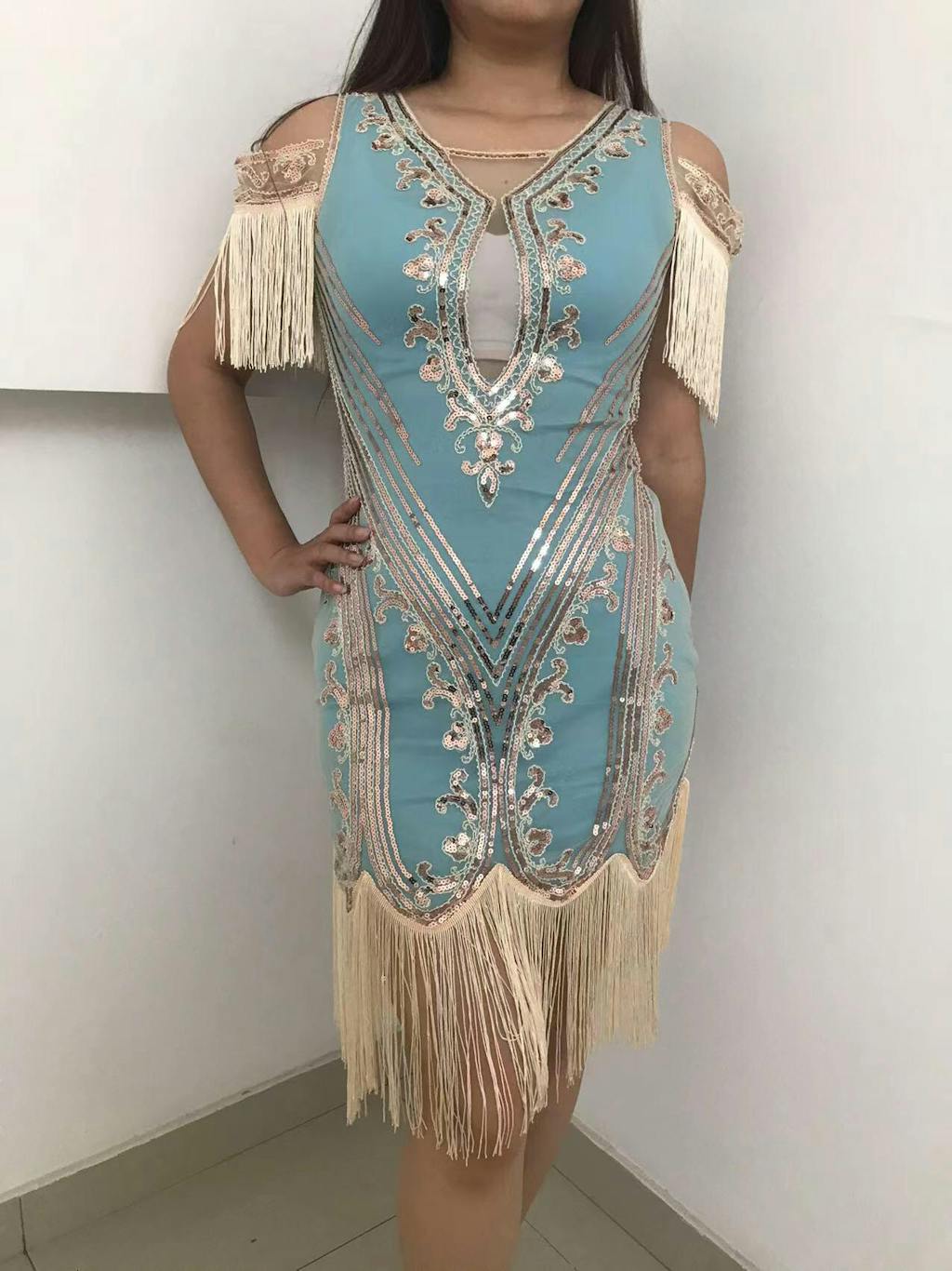 The dress was delivered on time and perfect for my 20s themed party. I am 5’8, 160 lbs and I ordered a large. I could’ve worn a medium but then it would’ve been tighter in areas and the large laid very nicely and gave me room to move better in it.