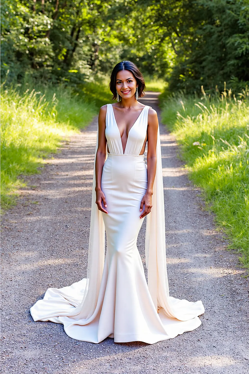 Simple Mermaid Deep V Neck Ivory Long Wedding Dress