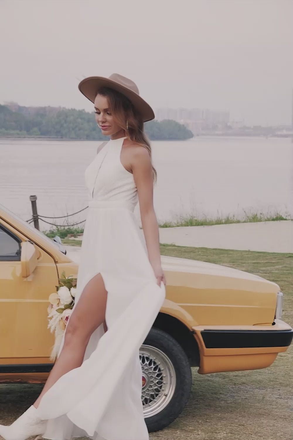 Ivory A-Line Halter Floor Length Lace Chiffon Boho Wedding Dress With Slit