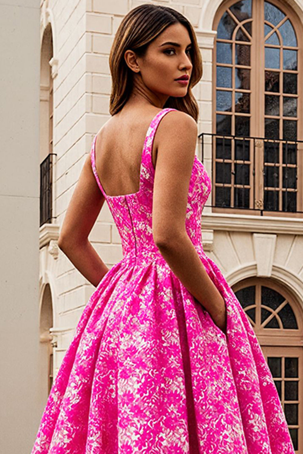 Fuchsia Printed A Line Long Wedding Guest Dress
