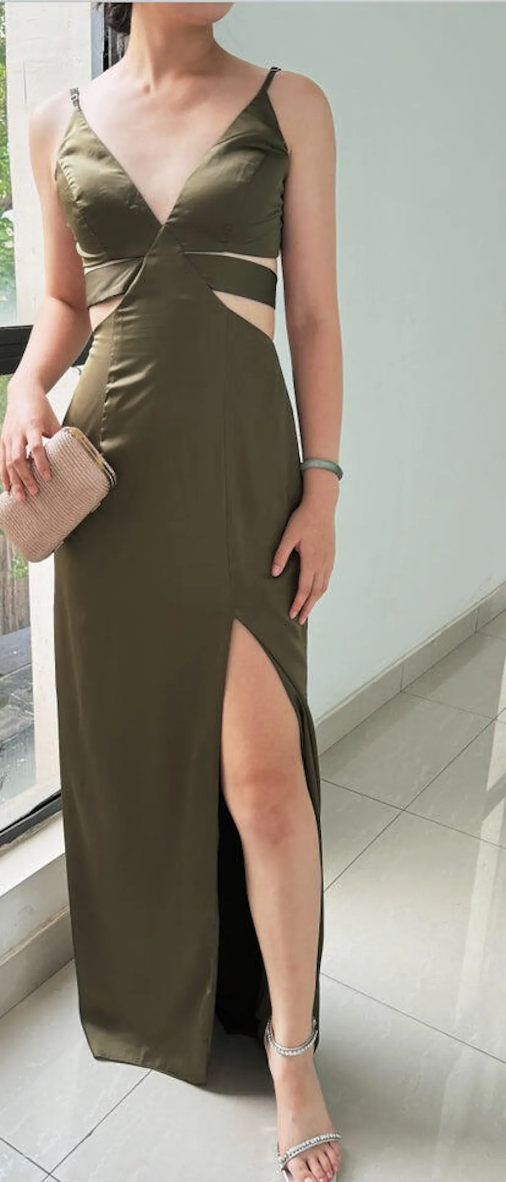 Olive Sheath Spaghetti Straps Cut Out Satin Bridesmaid Dress