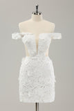Sheath Off The Shoulder Appliques Lace Cut Out Wedding Dress with Detachable Tulle