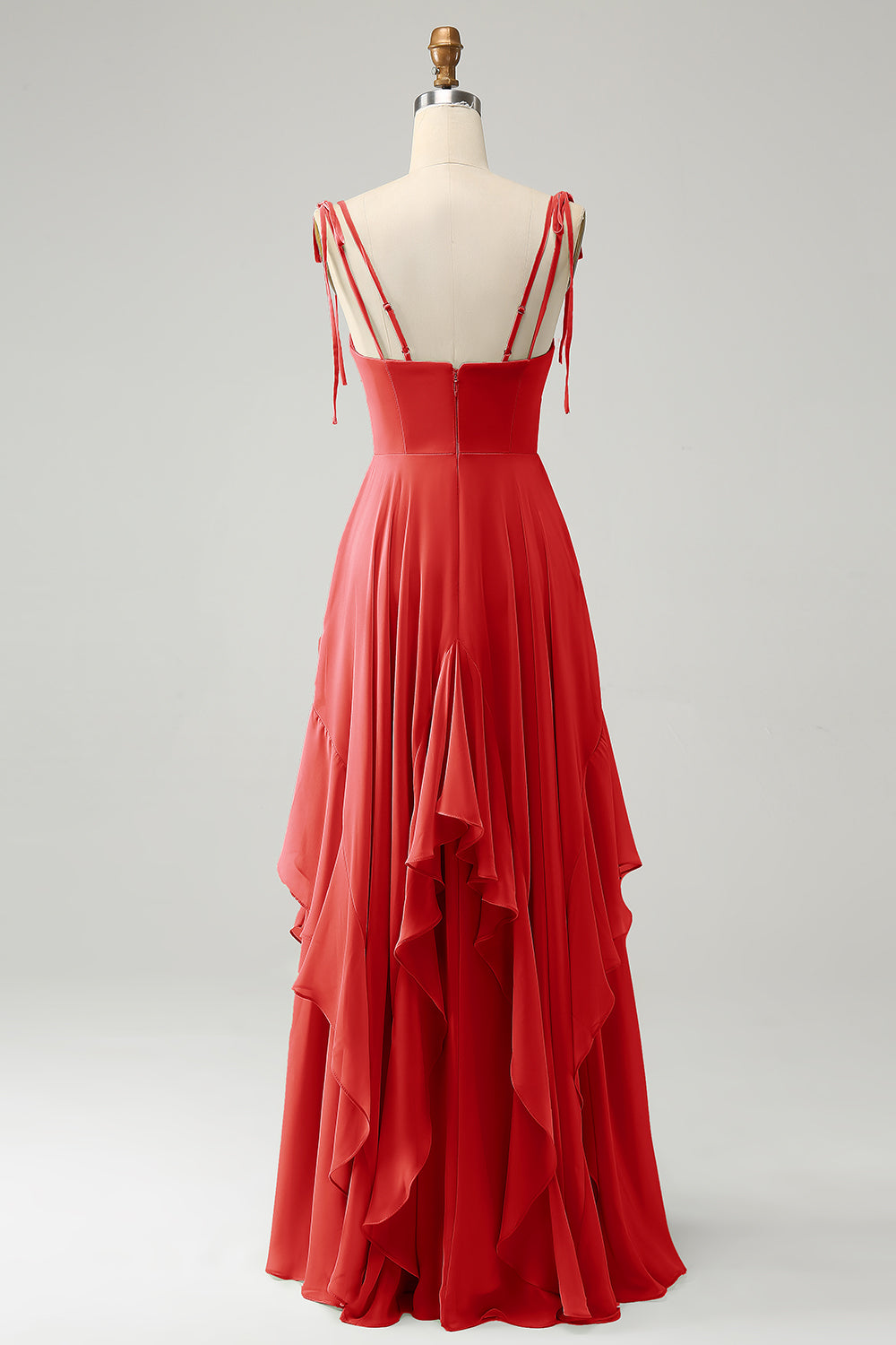 This enchanting bridesmaid dress features a beautiful A-line silhouette that effortlessly flatters all body types. The delicate spaghetti straps add a touch of elegance, while the soft chiffon fabric flows gracefully down into a floor-length hem. The gentle ruffles throughout the skirt add movement and texture, creating a dreamy and romantic look. This dress is the perfect choice for a sophisticated and timeless bridal party.