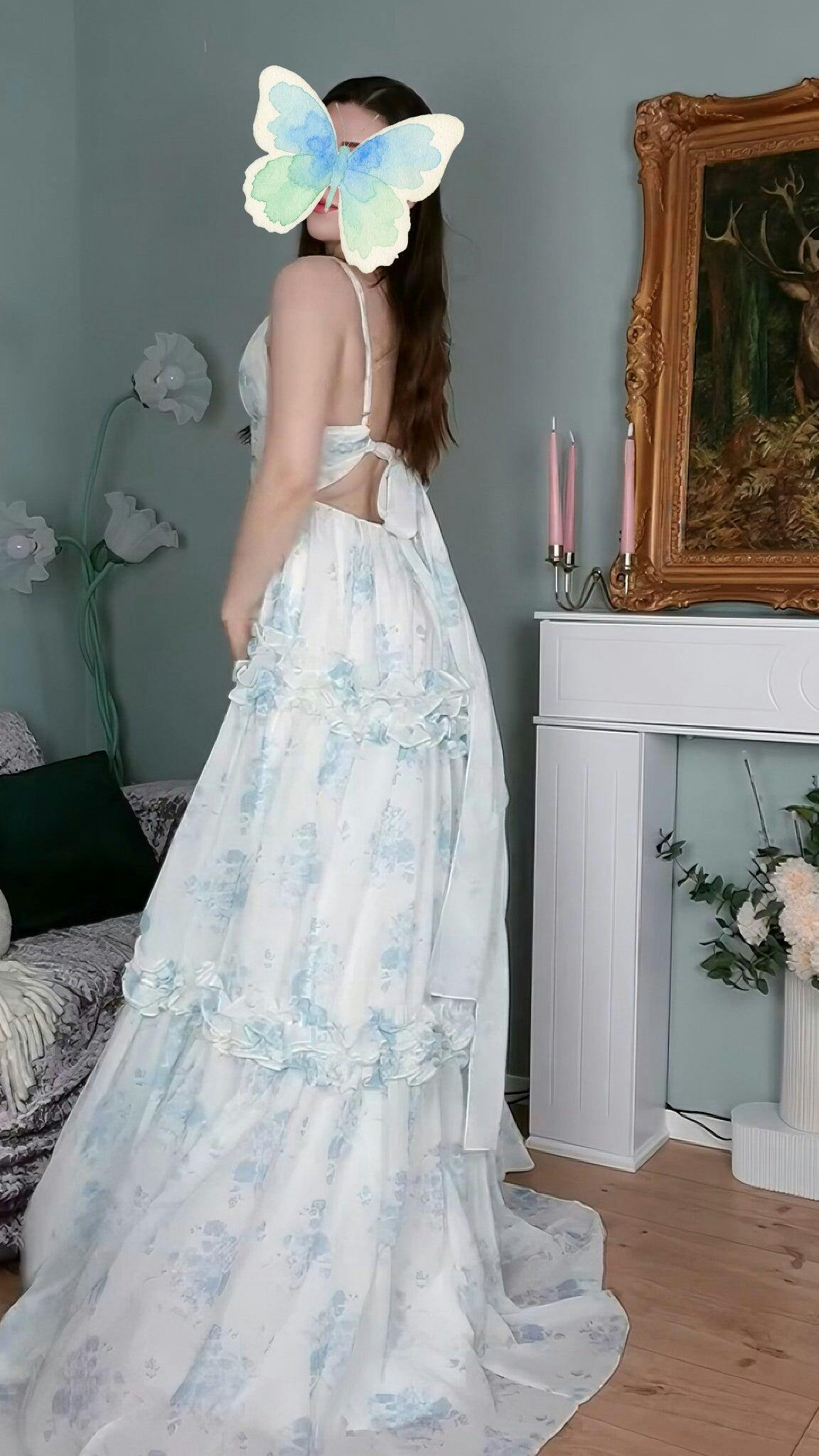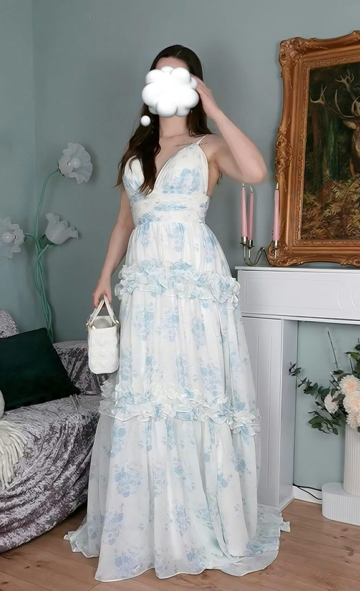 A-Line Spaghetti Straps Pleated White Blue Flower Maxi Bridesmaid Dress