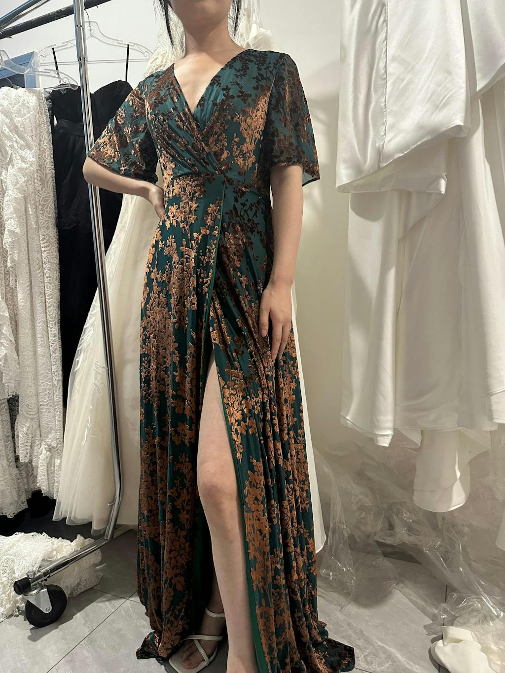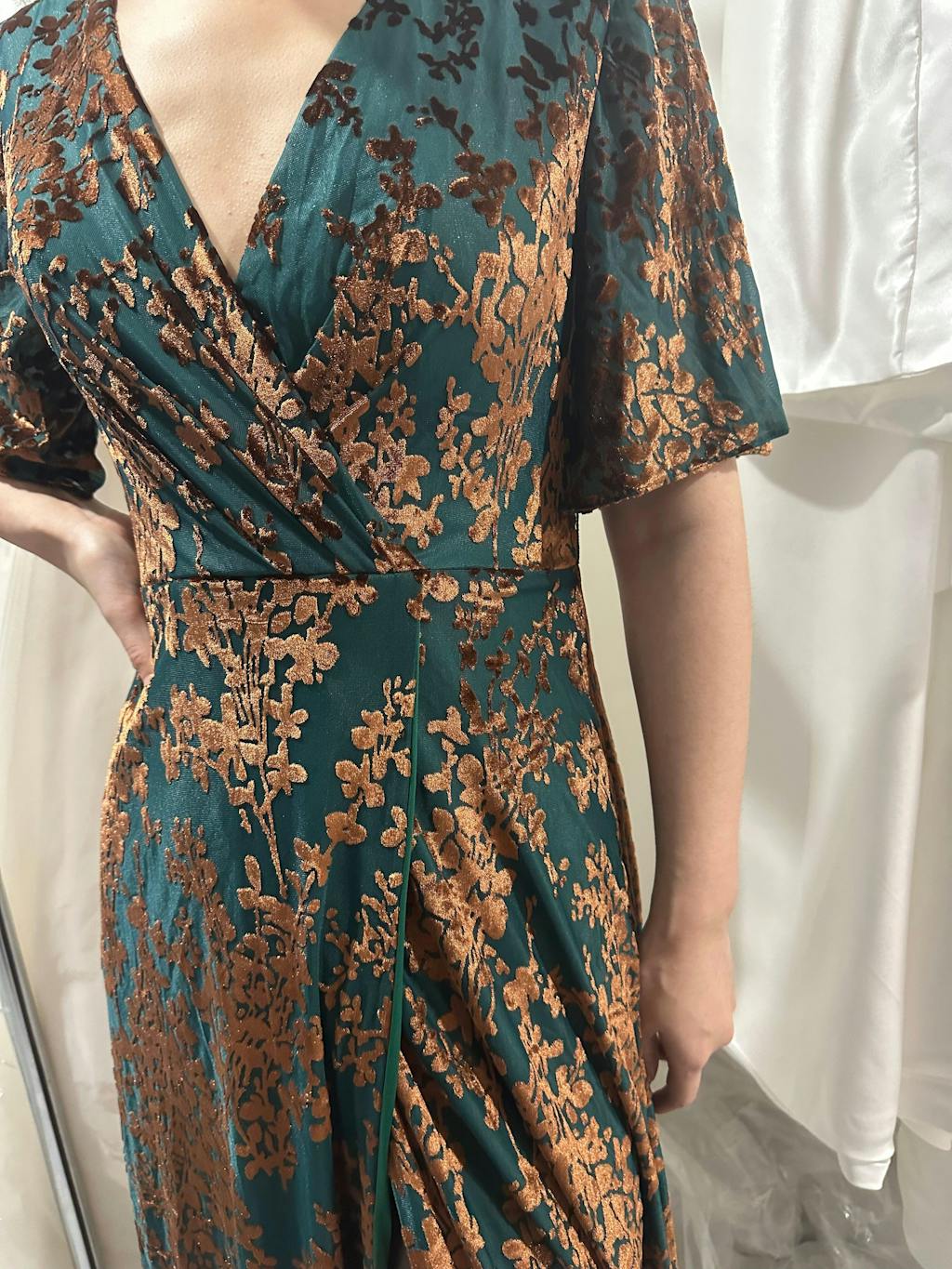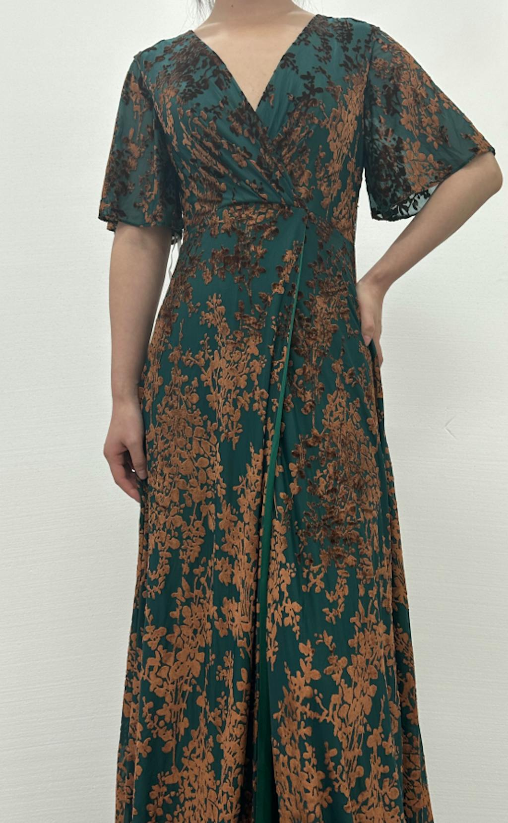 Wore this to a winter wedding and felt perfect! The velvet is warm enough for the season but the burnout detail keeps it from feeling heavy. The V-neck is very becoming, and the A-line dress flows beautifully. The floor length is so elegant. Highly recommend!