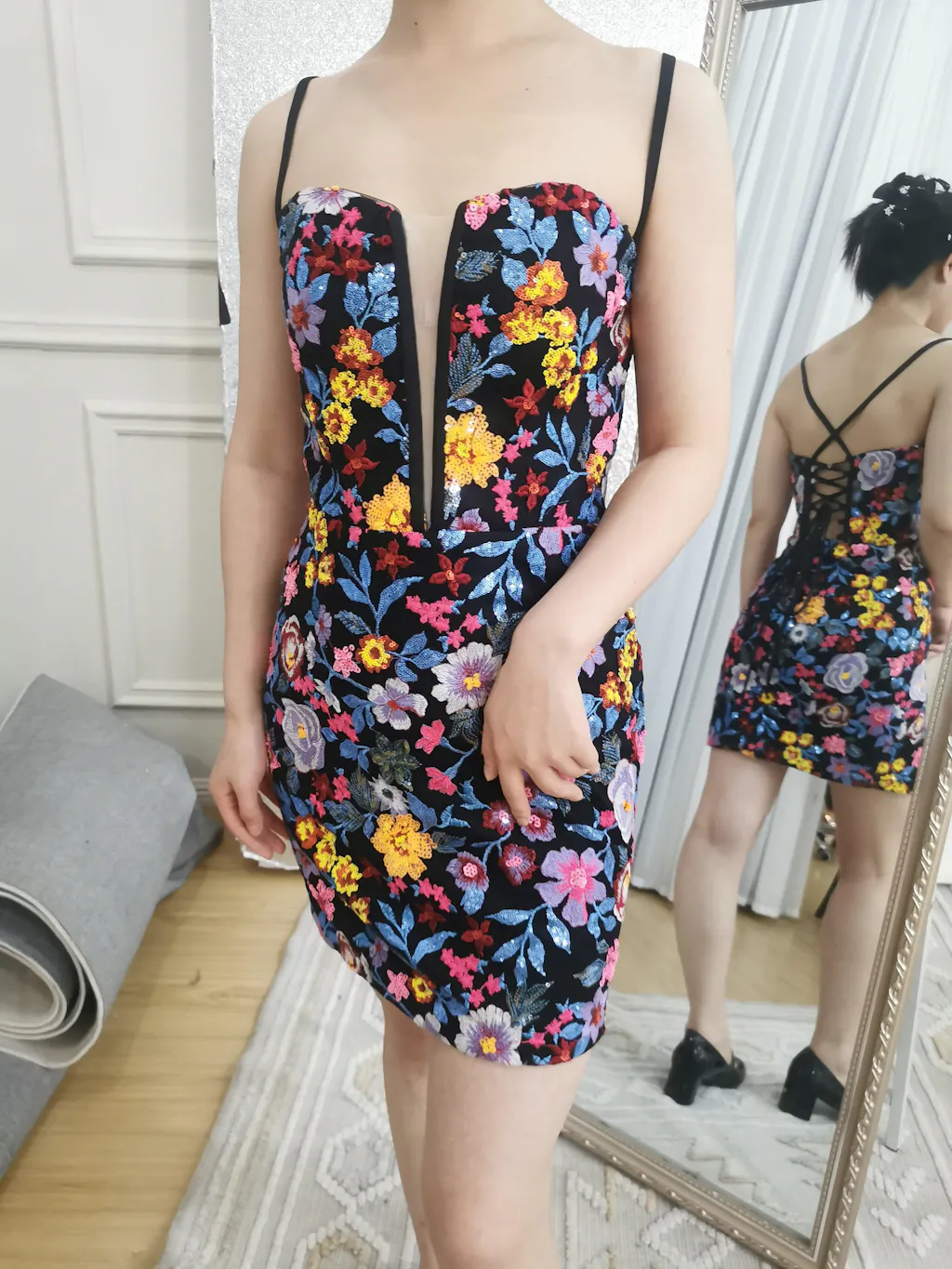 Black Flower Mermaid Spaghetti Straps Embroidered Short Homecoming Dress