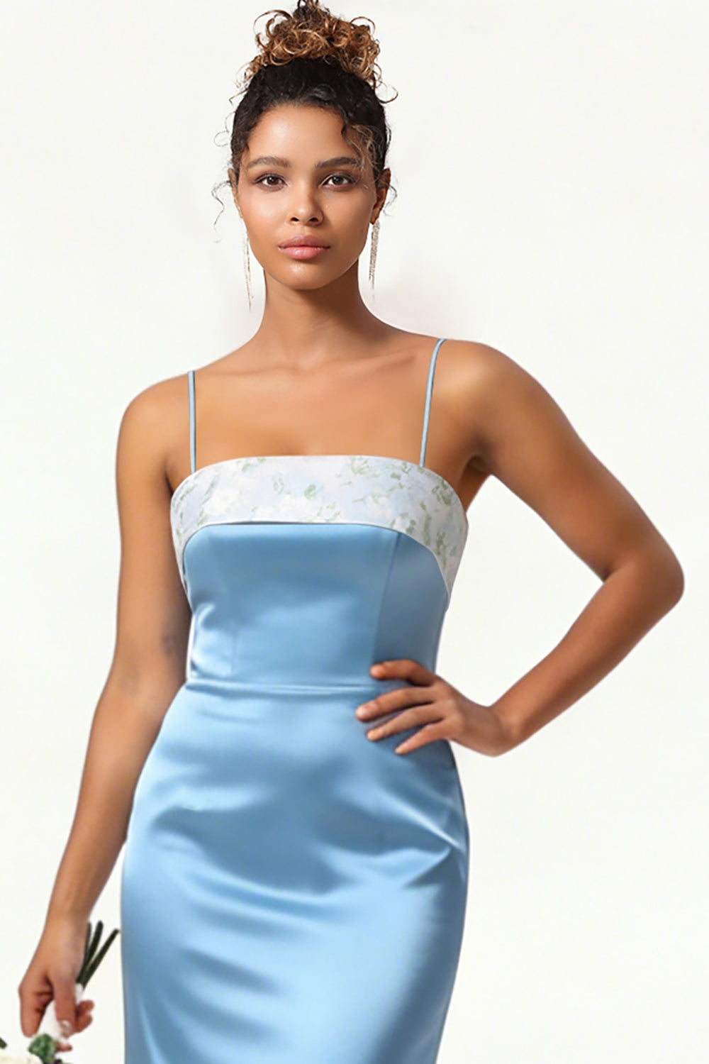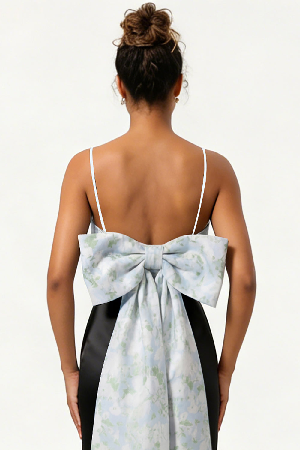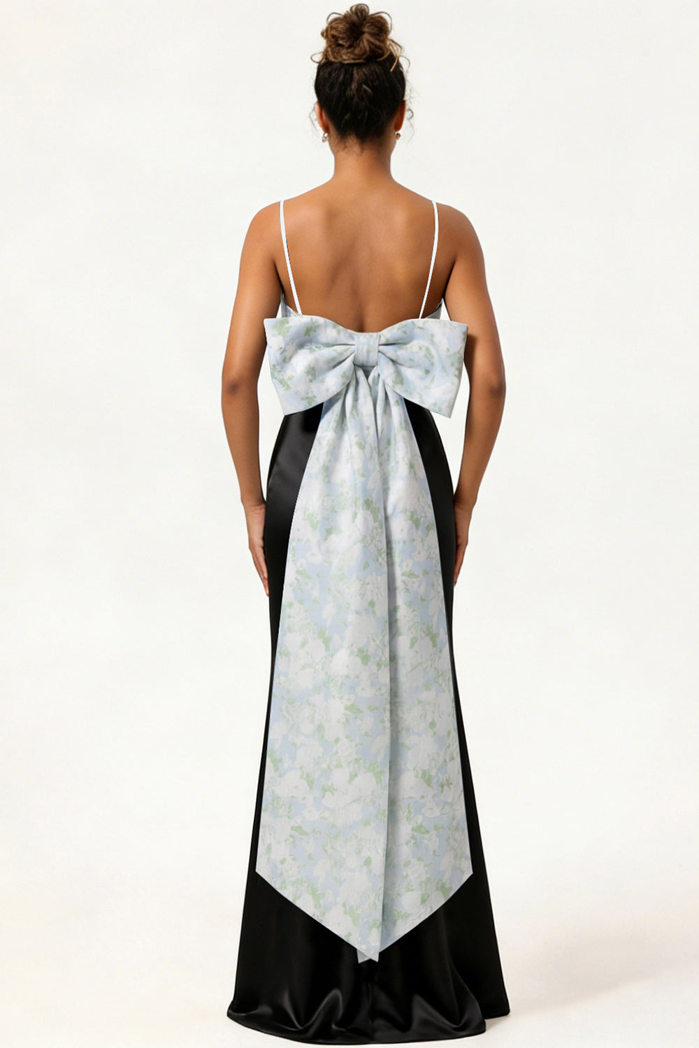 Blue Floral Spaghetti Straps Mermaid Satin Bridesmaid Dress with Bow
