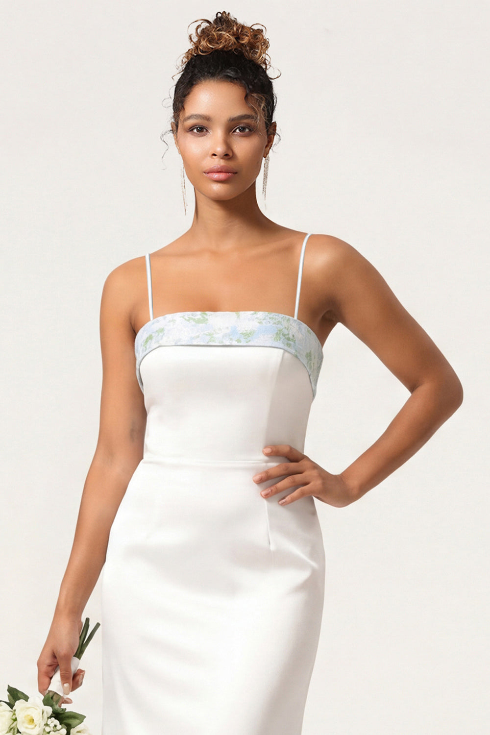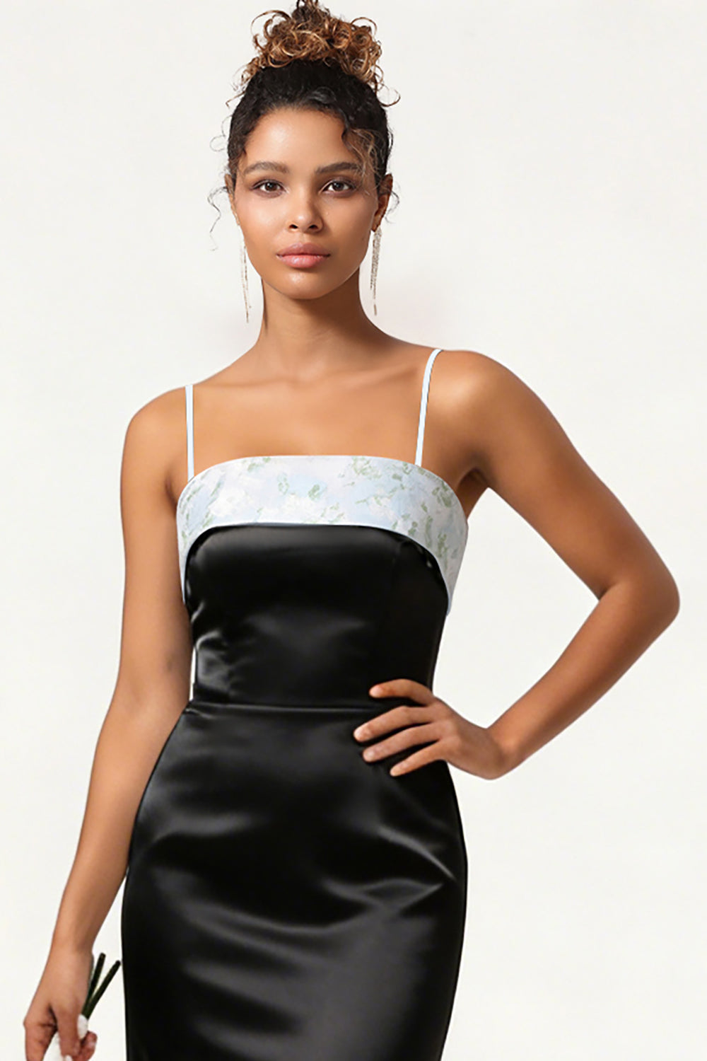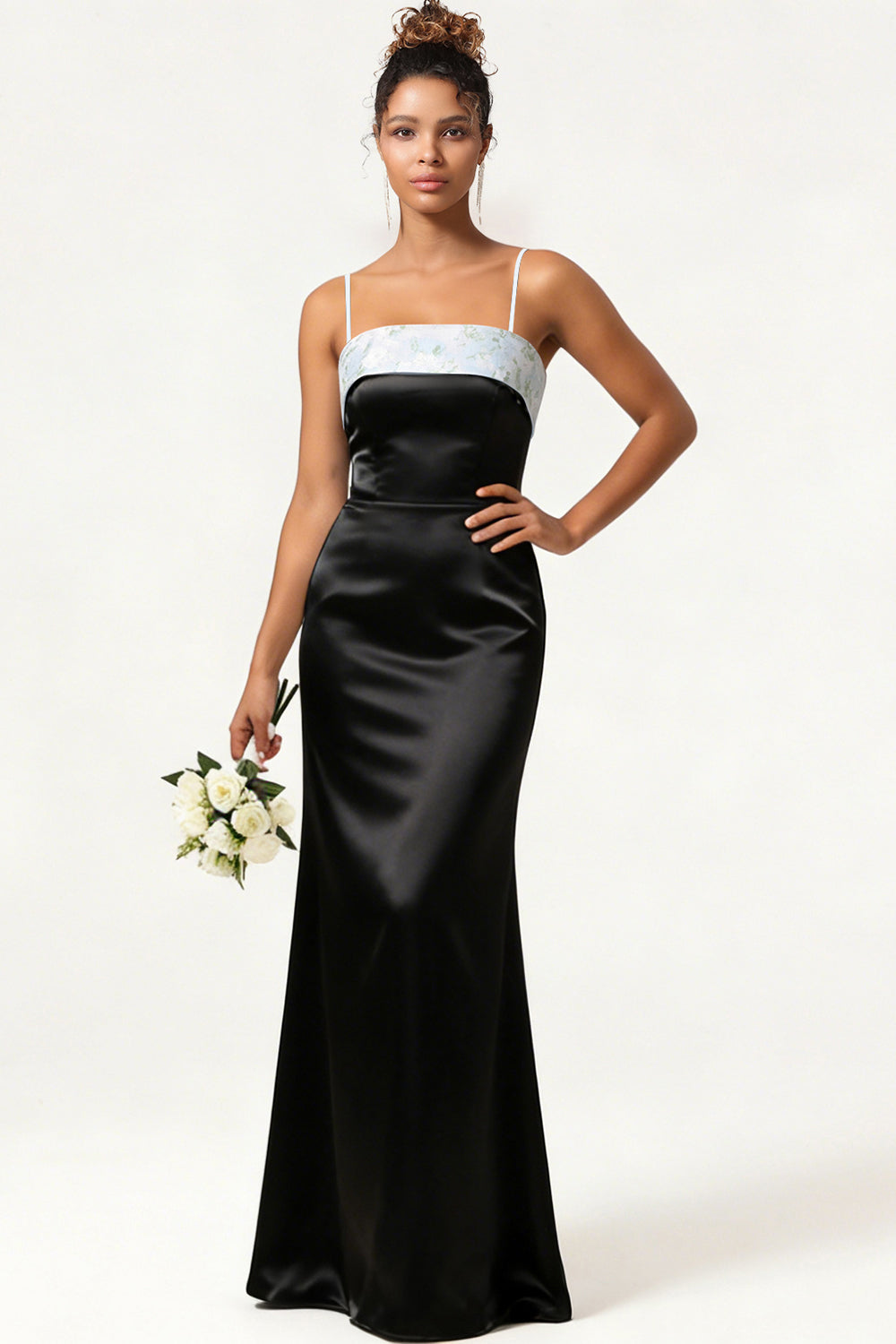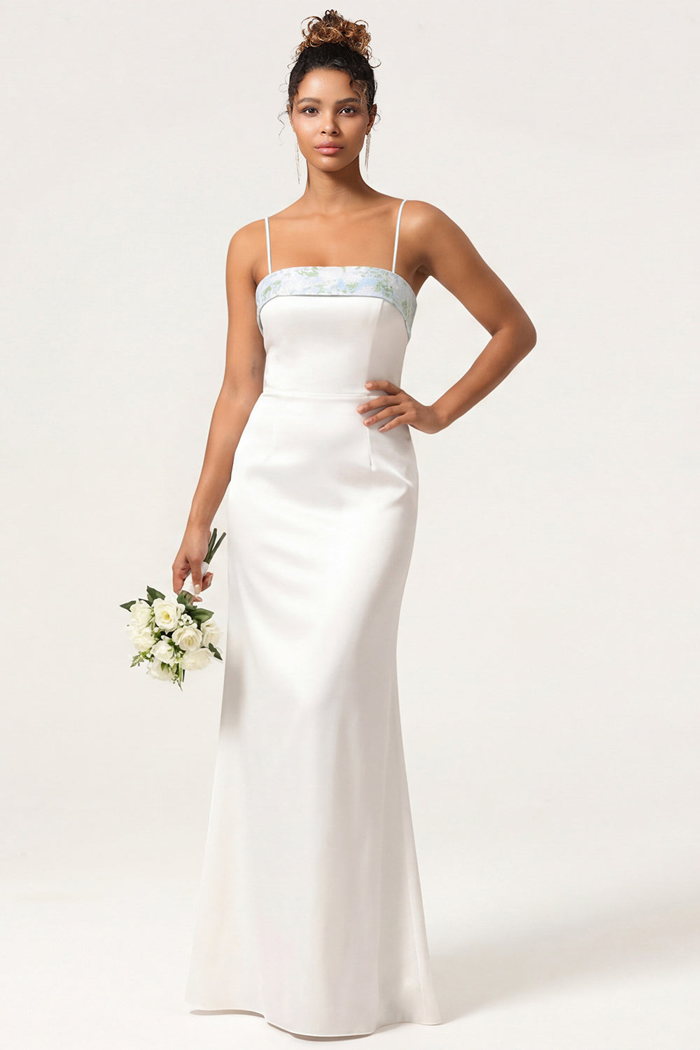 Blue Floral Spaghetti Straps Mermaid Satin Bridesmaid Dress with Bow