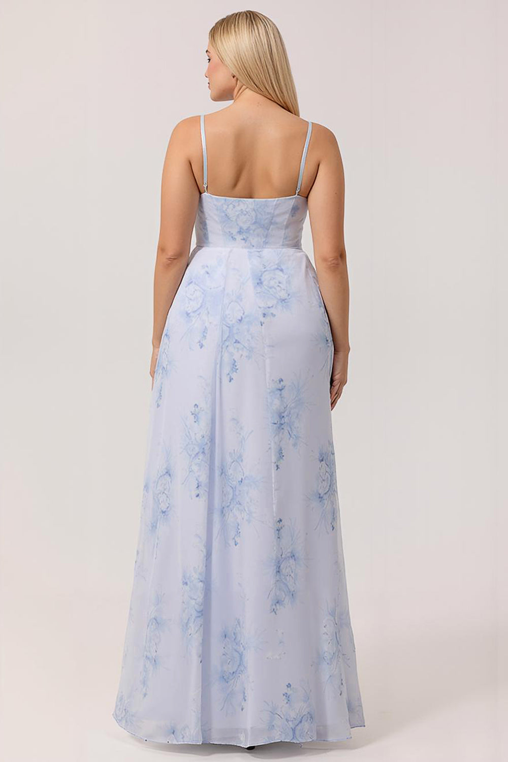 Blue Floral Spaghetti Straps Mermaid Streamer Corset Long Plus Size Bridesmaid Dress with Slit