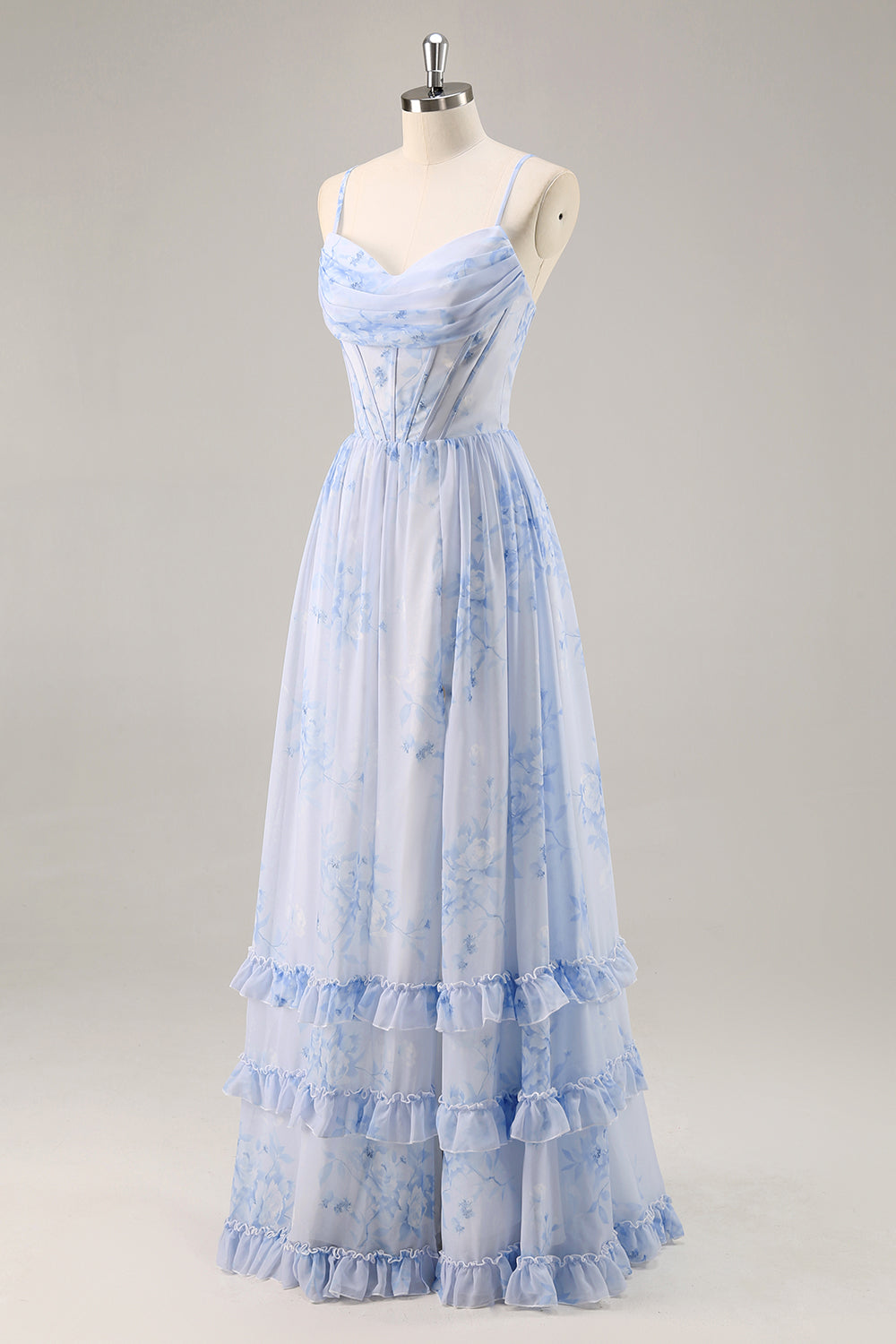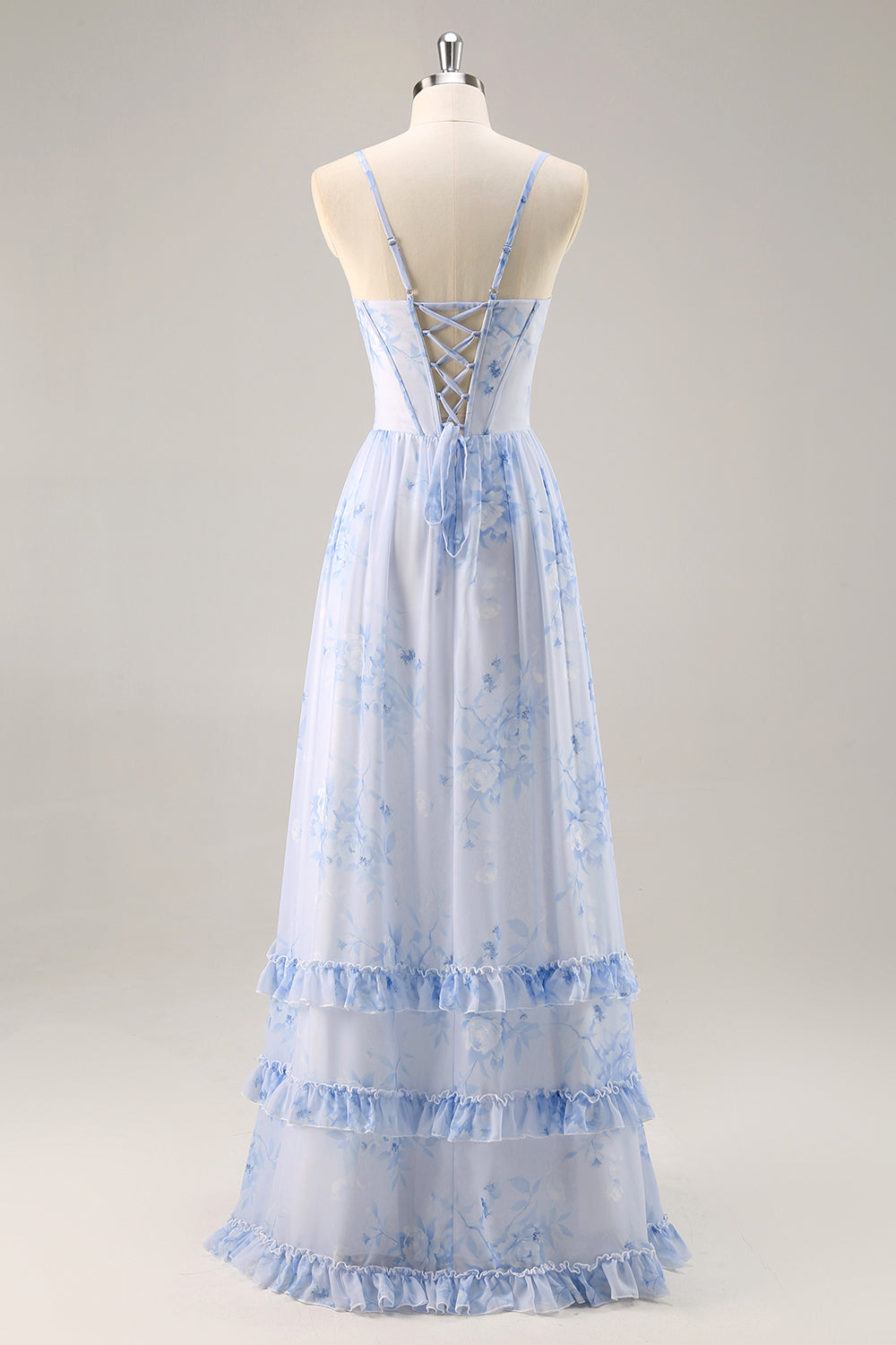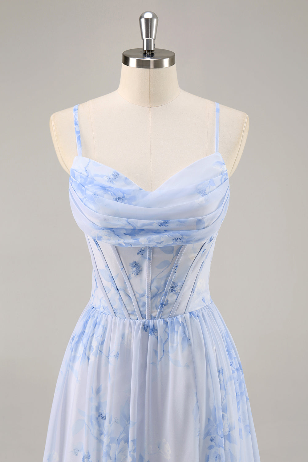 Blue Flower A-Line Cowl Neck Corset Long Bridesmaid Dress with Slit
