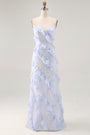 Blue Flower A-Line Printed Long Bridesmaid Dress with Lace Up Back