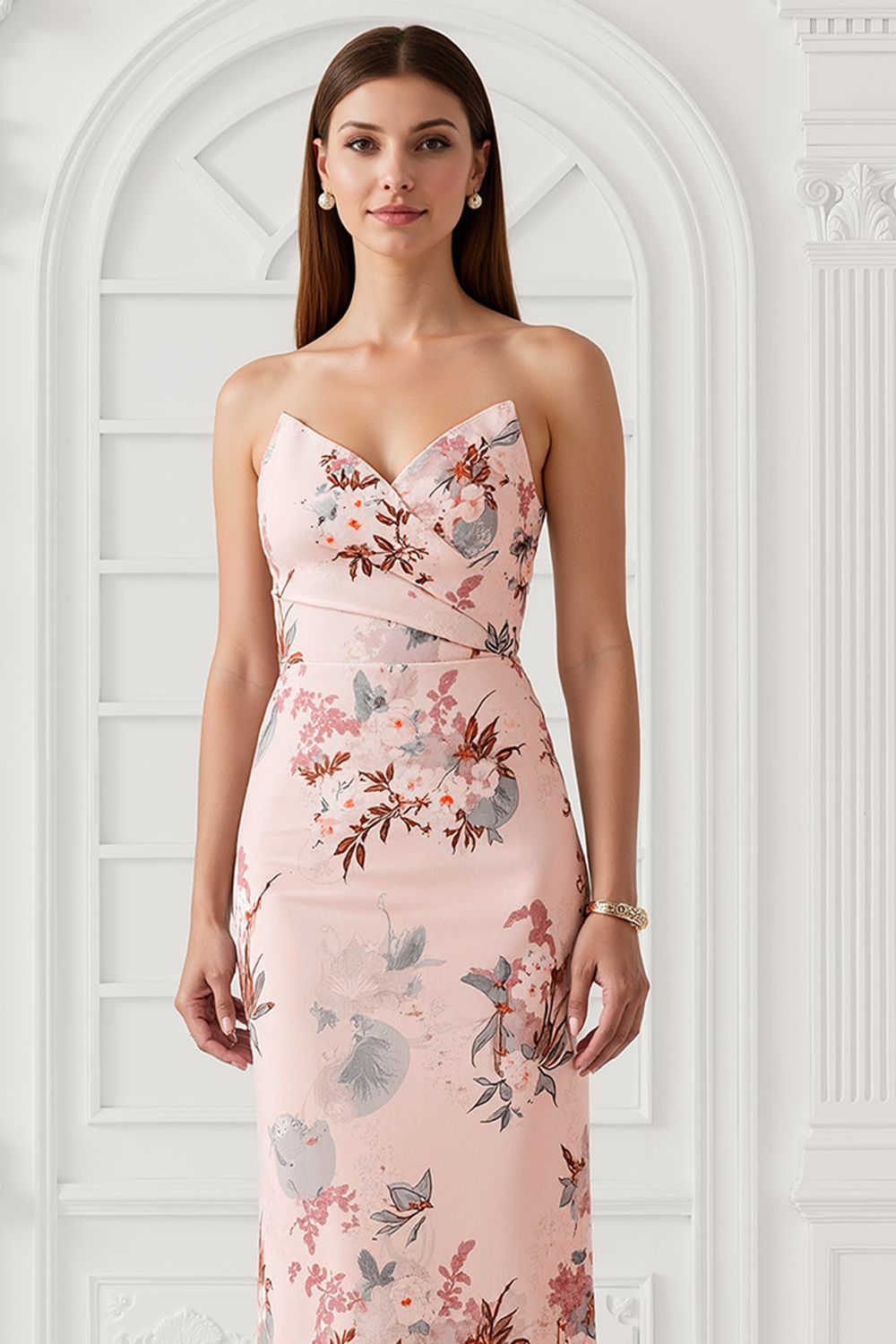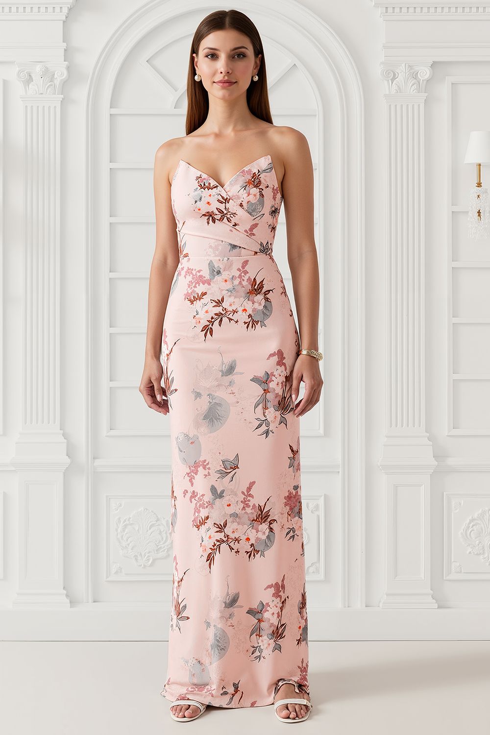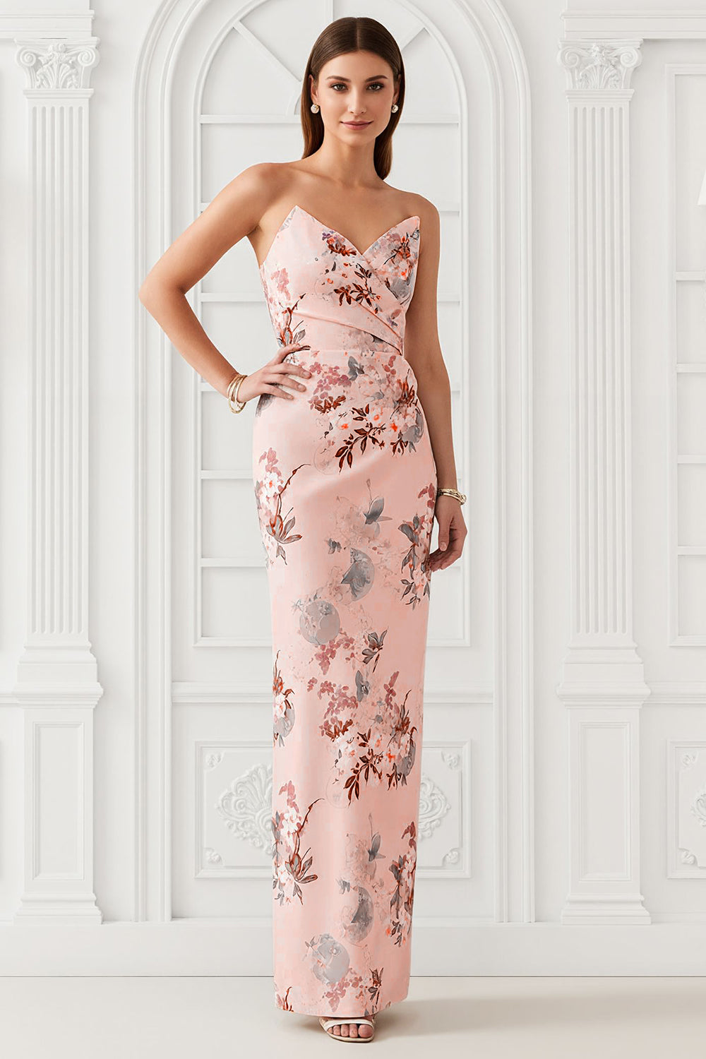 Blush Flower Sheath Strapless Print Satin Long Bridesmaid Dress with Back Slit