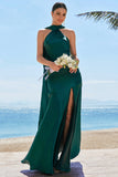 Dark Green Mermaid Halter Floor Length Satin Bridesmaid Dress