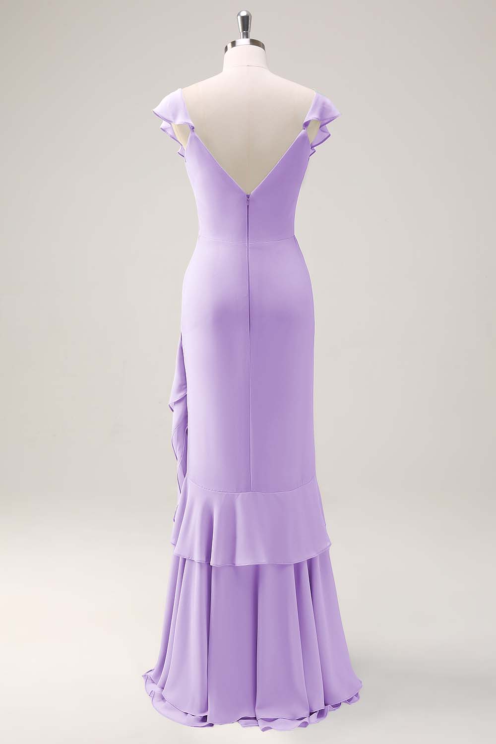 Dusty Sage Sheath V Neck Open Back Chiffon Long Bridesmaid Dress with Ruffles