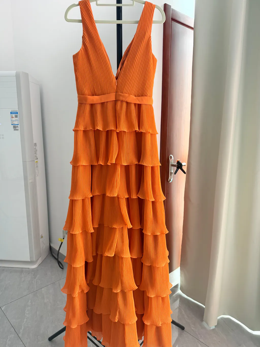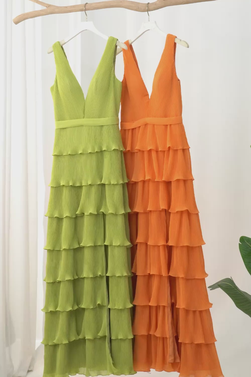 This dress is an ethereal vision of elegance, featuring delicately pleated fabric that cascades into layered ruffles for a flowing, graceful effect. The deep V-neckline and fitted bodice create a flattering silhouette, while the cinched waist enhances the feminine shape. The tiered pleated skirt adds depth and movement, making this gown a stunning choice for any formal occasion.