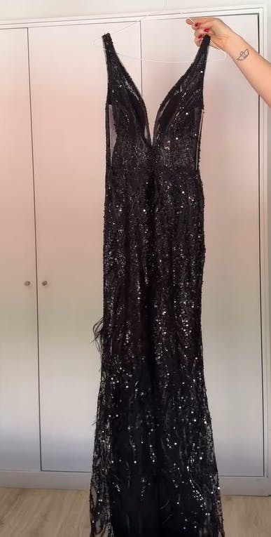 Glitter Black Mermaid Long Corset Feathered Prom Dress With Slit