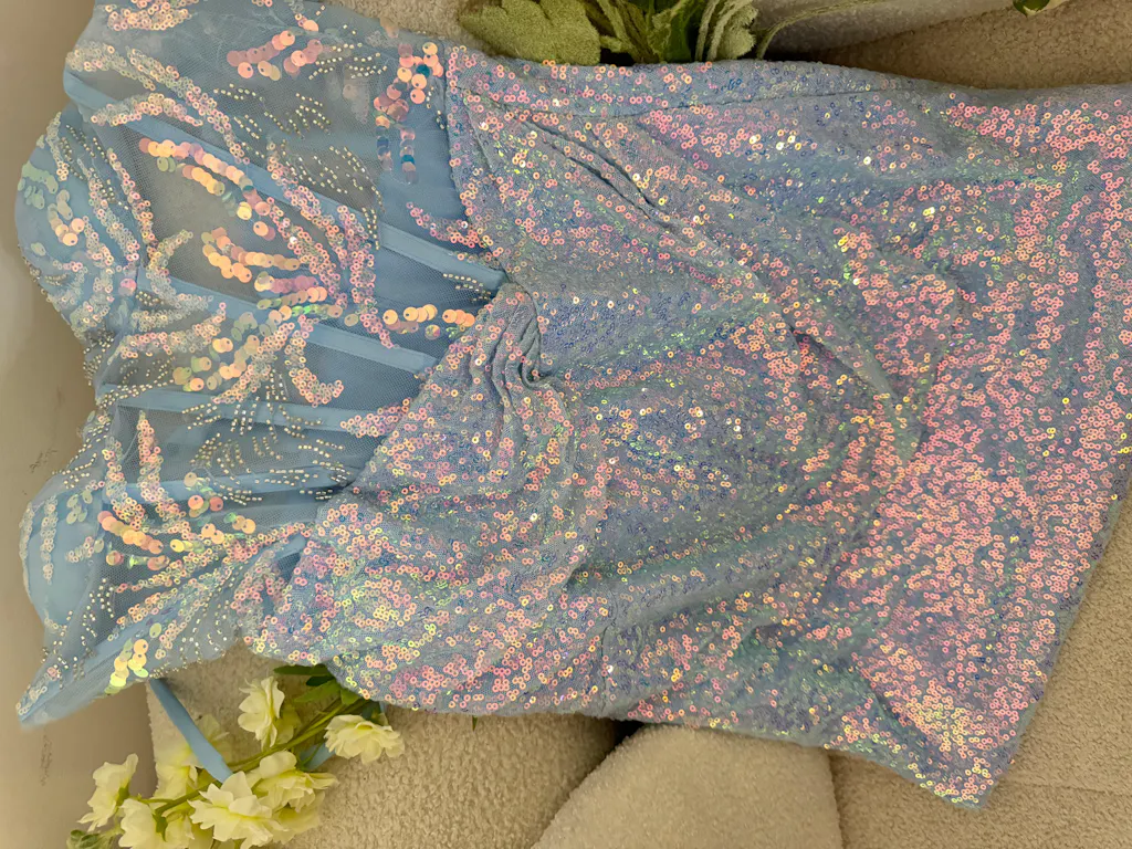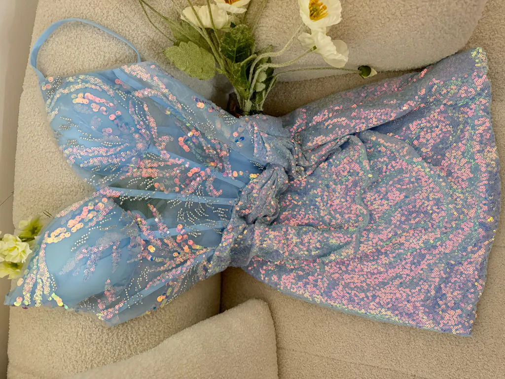 Glitter Light Blue Tight Spaghetti Straps Corset Short Homecoming Dress with Sequins