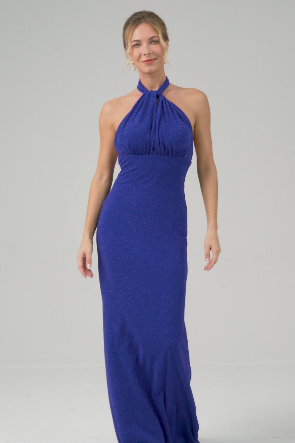 Glitter Mermaid Blue Halter Pleated Backless Long Prom Dress