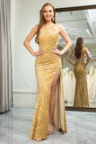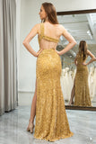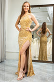 Golden Mermaid One Shoulder Fringe Glitter Sequin Prom Dress With Slit
