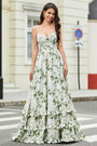 Green Asymmetrical Strapless Print Floral Long Bridesmaid Dress with Pocket