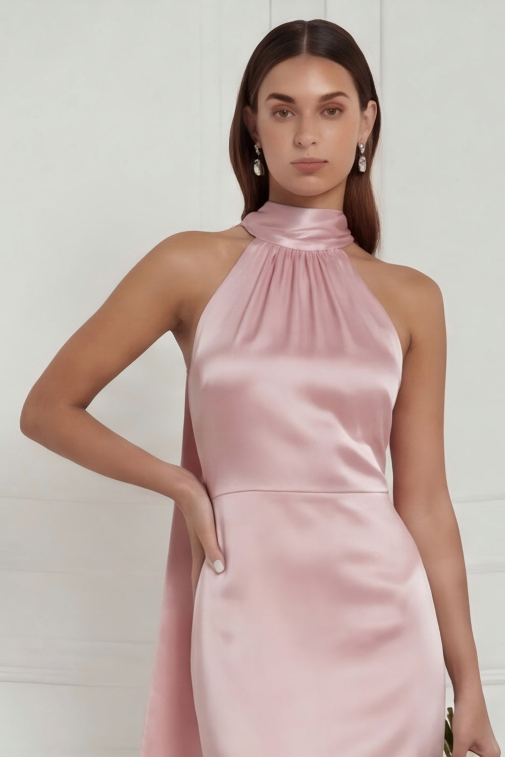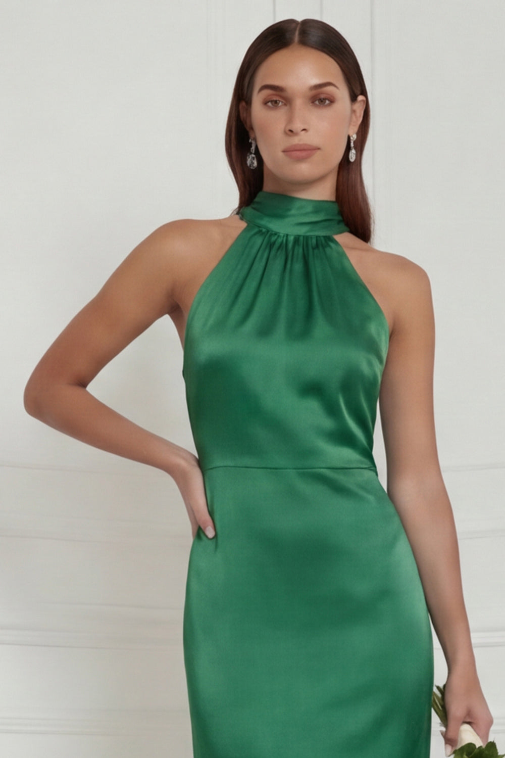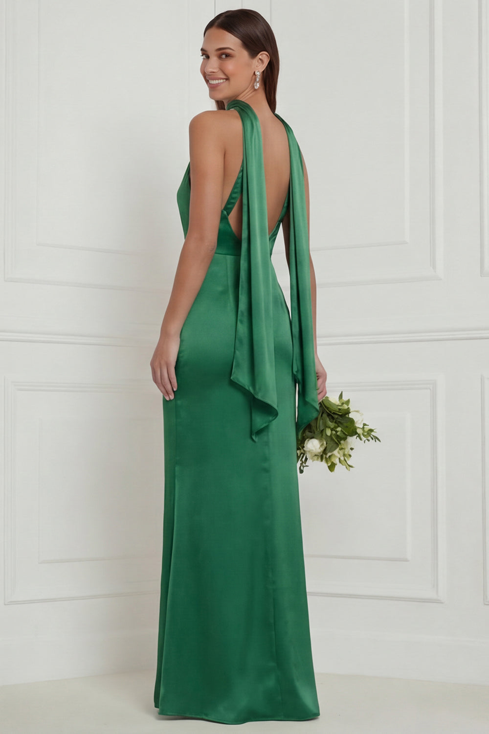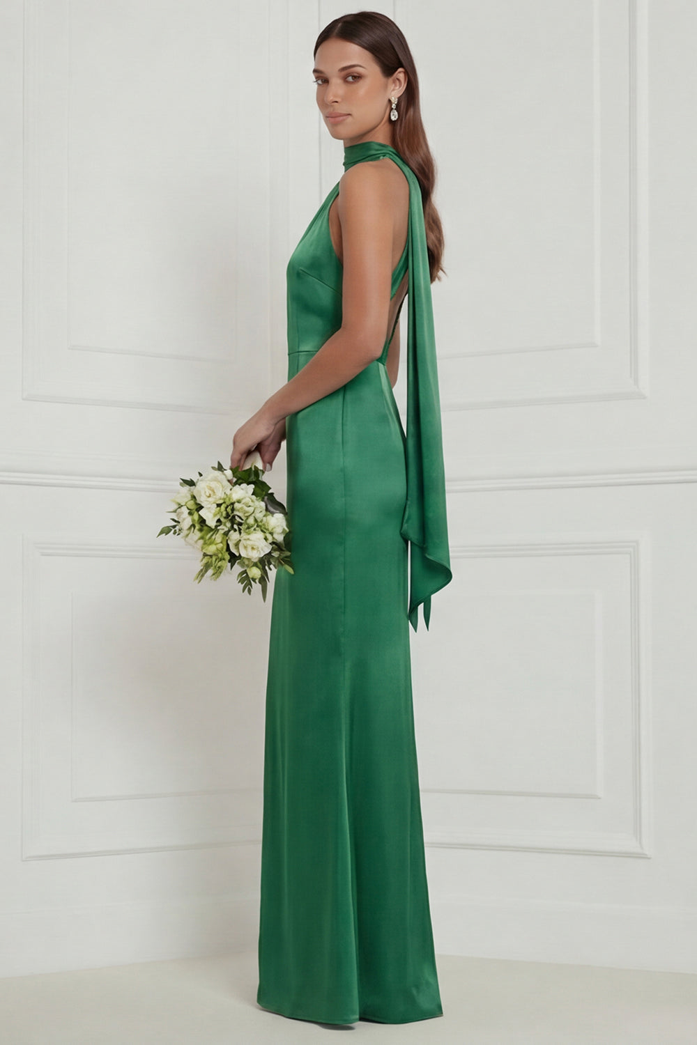 Green Halter Mermaid Satin Long Bridesmaid Dress with Streamer